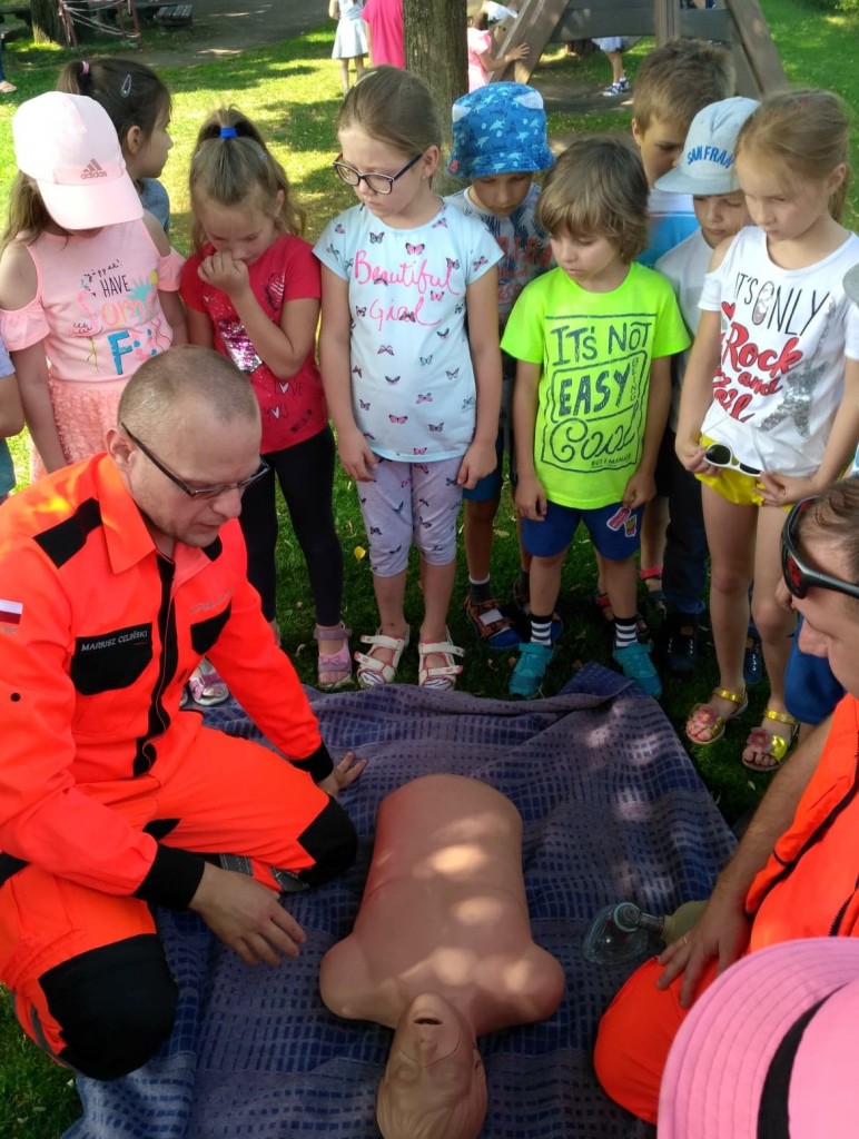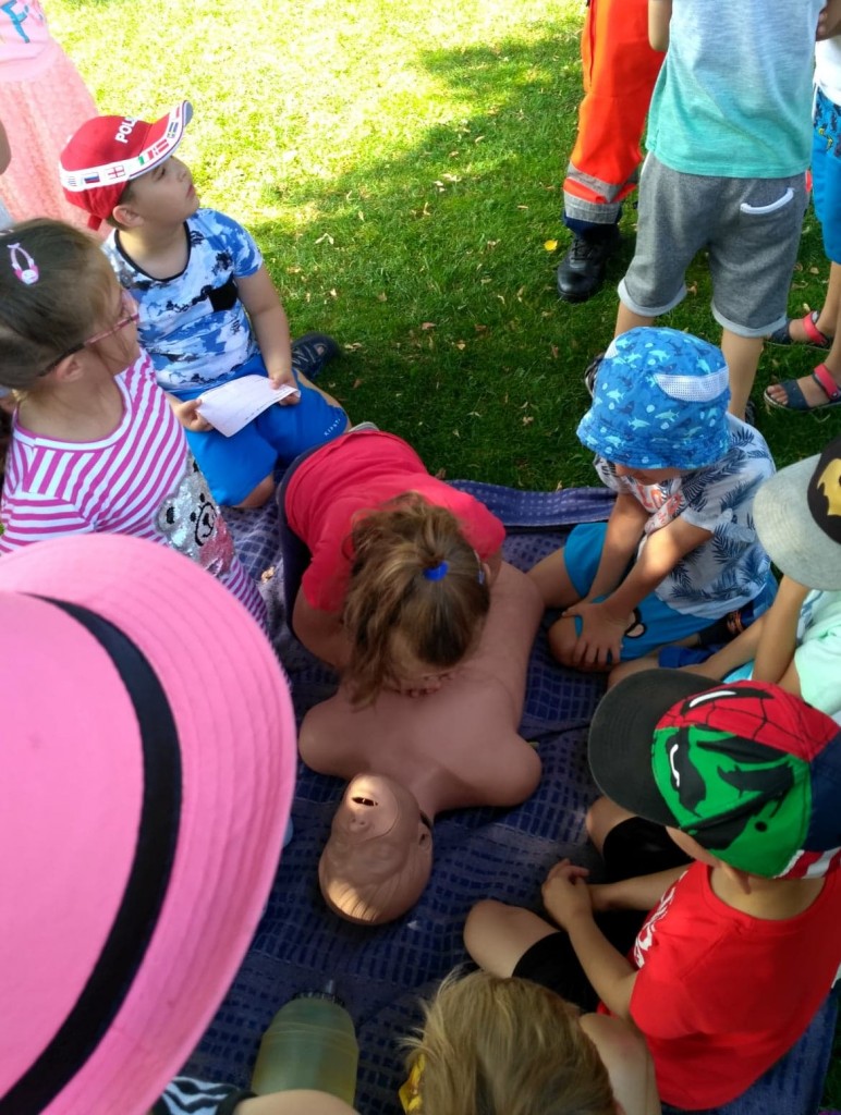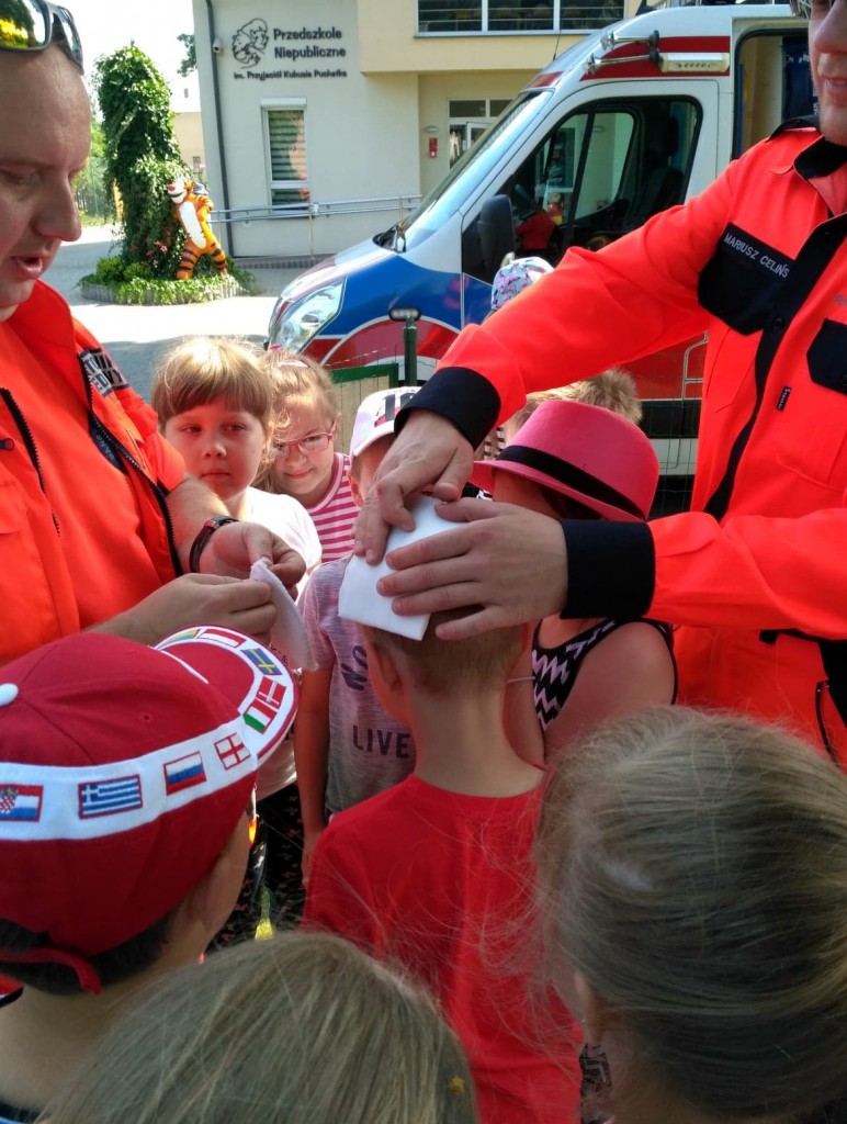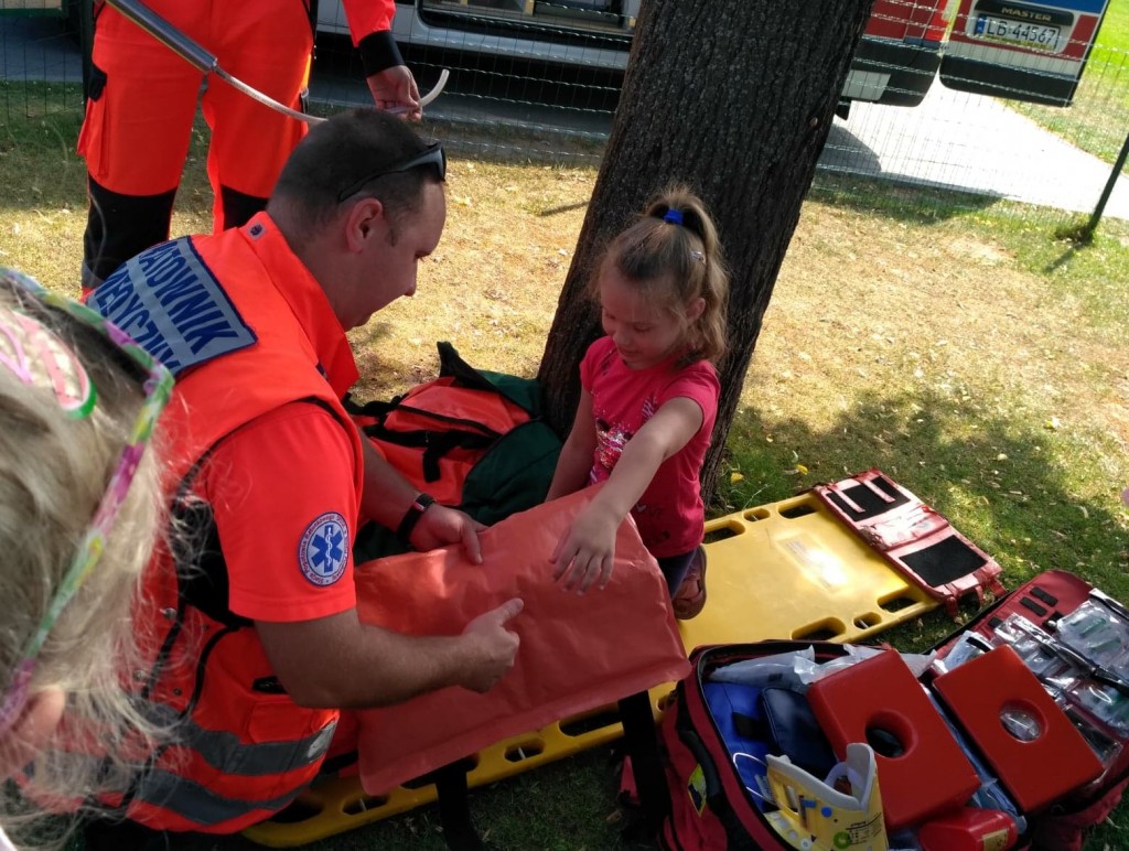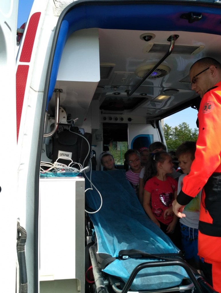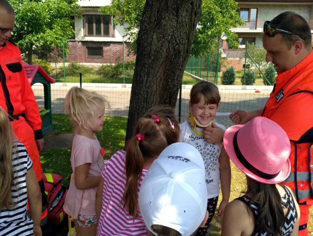Panowie pozwolili dzieciom zajrzeć do wnętrza karetki, gdzie zaprezentowali w jaki sposób udzielają pierwszej pomocy przedmedycznej. Ochotnicy mogli na własnej skórze doświadczyć niektórych zabiegów. Największym wyzwaniem okazało się prawidłowe wykonanie masażu serca. Dzieci wkładały całe serca żeby tylko uratować fantomowego pacjenta. Na koniec ratownicy pożegnali nas głośnym sygnałem karetki a przedszkolaki bogatsze o nowe doświadczenia powróciły do zabawy na świeżym powietrzu.