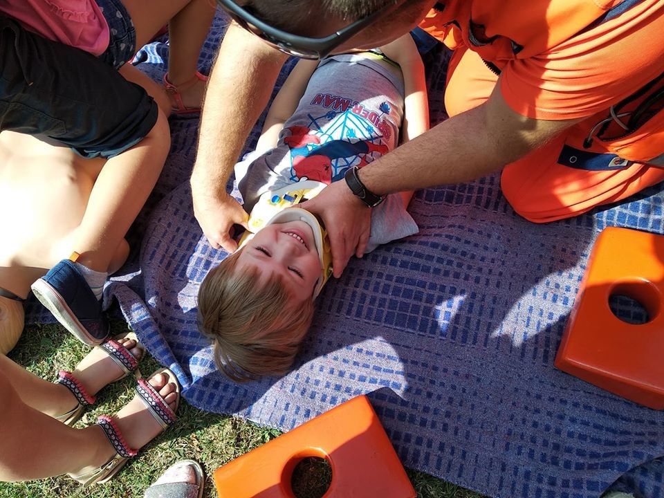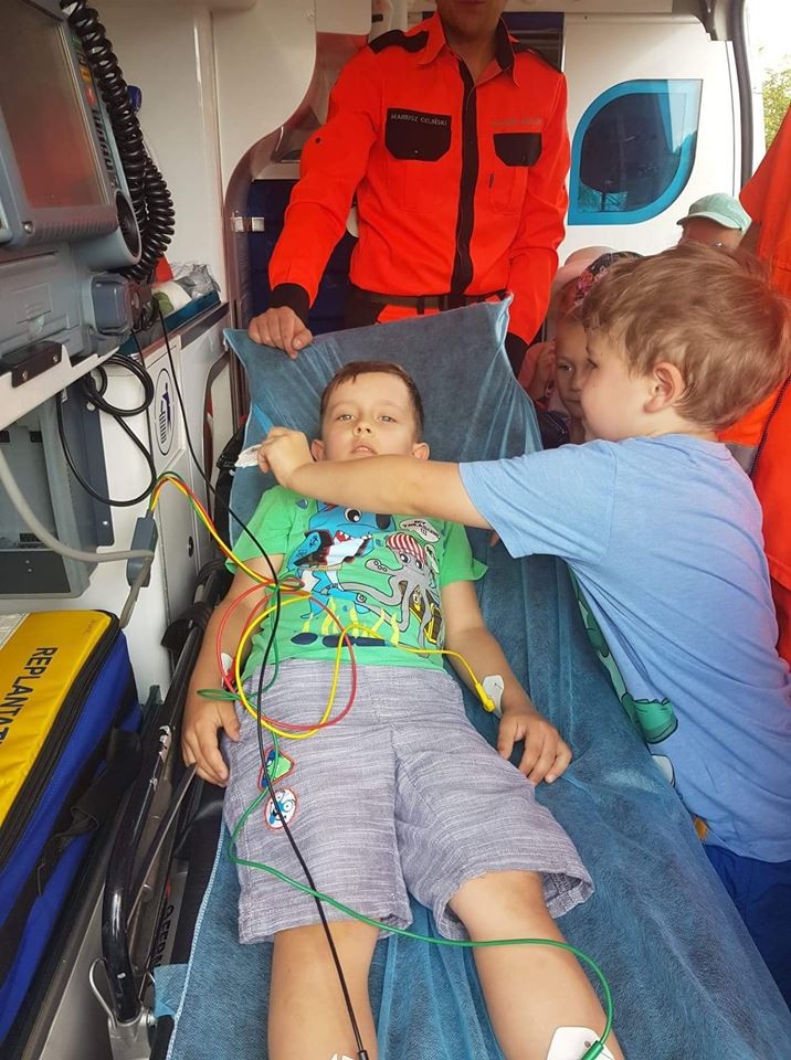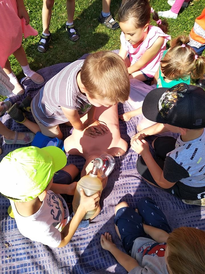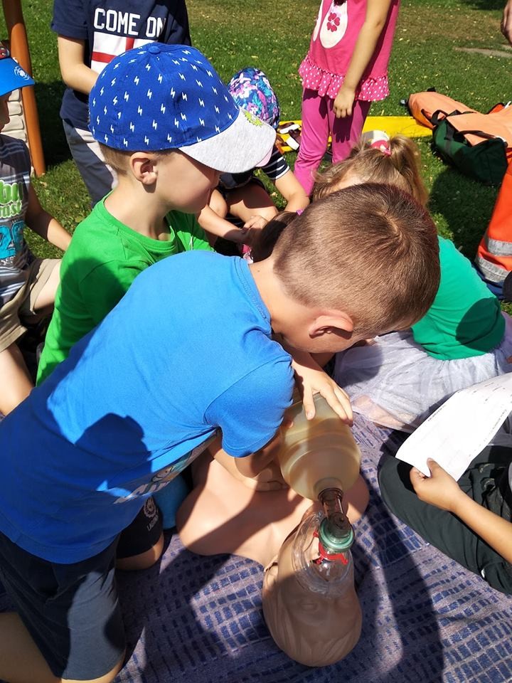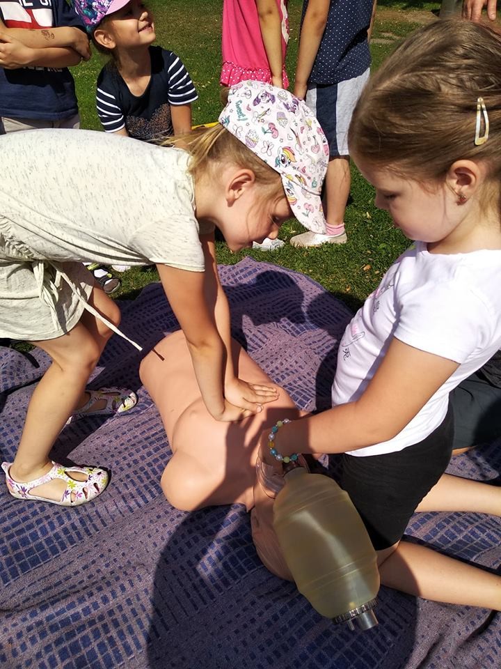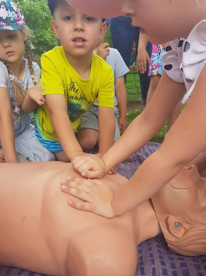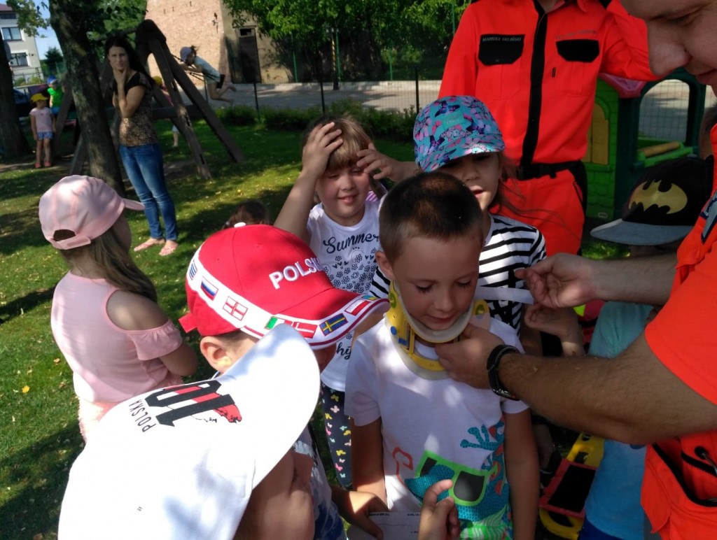 Panowie pozwolili dzieciom zajrzeć do wnętrza karetki, gdzie zaprezentowali w jaki sposób udzielają pierwszej pomocy przedmedycznej. Ochotnicy mogli na własnej skórze doświadczyć niektórych zabiegów. Największym wyzwaniem okazało się prawidłowe wykonanie masażu serca. Dzieci wkładały całe serca żeby tylko uratować fantomowego pacjenta. Na koniec ratownicy pożegnali nas głośnym sygnałem karetki a przedszkolaki bogatsze o nowe doświadczenia powróciły do zabawy na świeżym powietrzu.