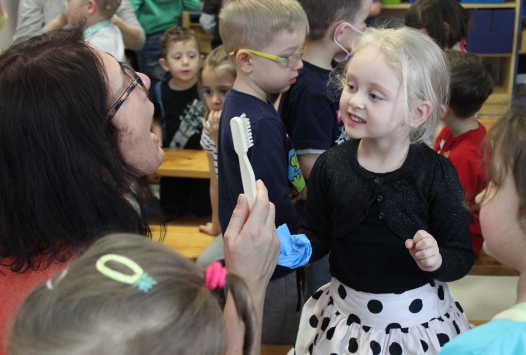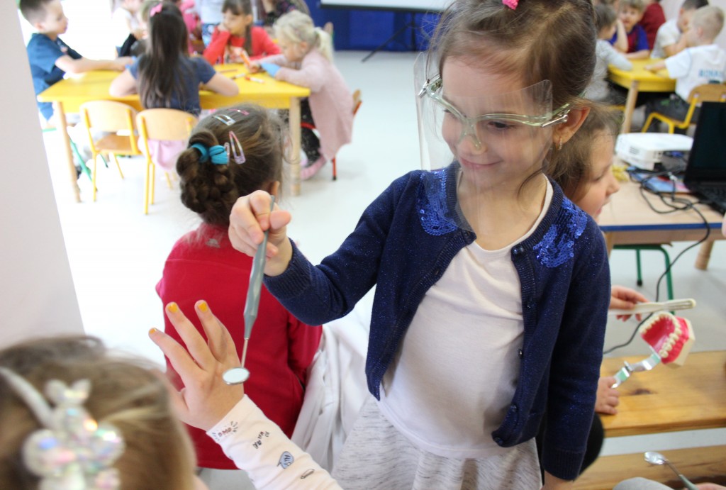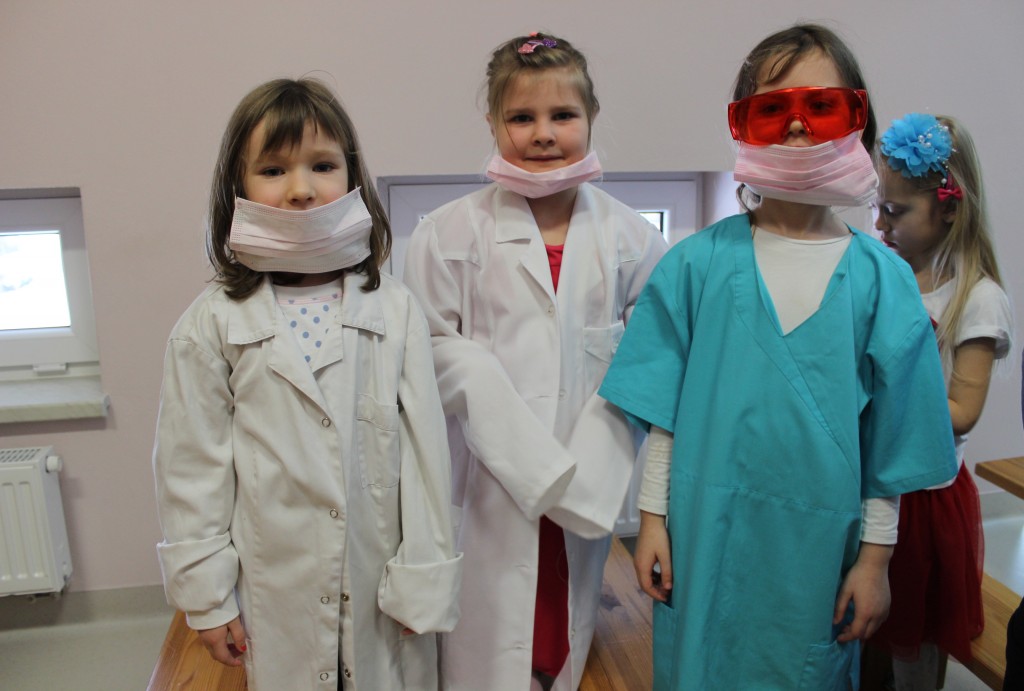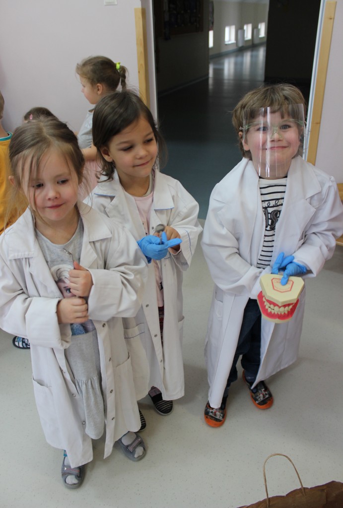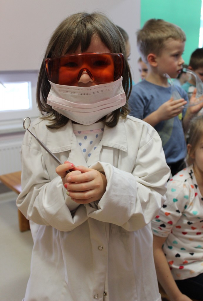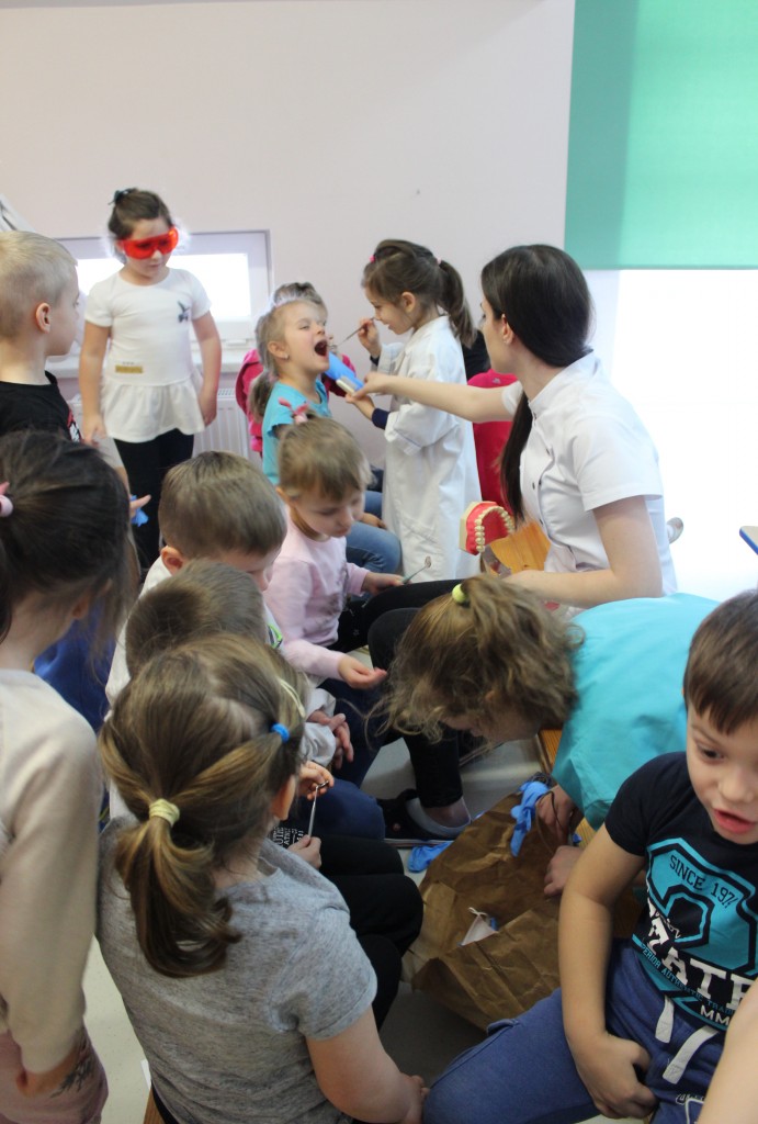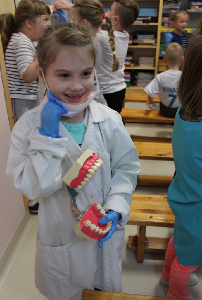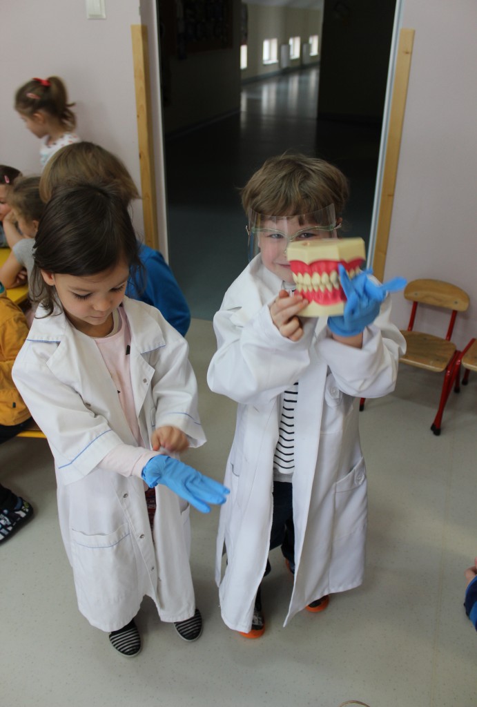Zajęcia bogate były w różnorodne działania. Na początek dzieci obejrzały krótką bajkę z dr Ząbkiem w roli głównej, następnie Pani doktor oraz Pani higienistka przeprowadziły krótką pogadankę na temat higieny jamy ustnej oraz wizyt kontrolnych u dentysty. Niesamowitą atrakcją okazała się prezentacja atrybutów stomatologa. Dzieci miały okazję przymierzyć fartuchy, rękawiczki, zapoznać się ze sprzętami i na chwilę zamienić w prawdziwych dentystów. Na koniec każdy otrzymał dyplom upamiętniający odwiedziny naszych gości w przedszkolu.