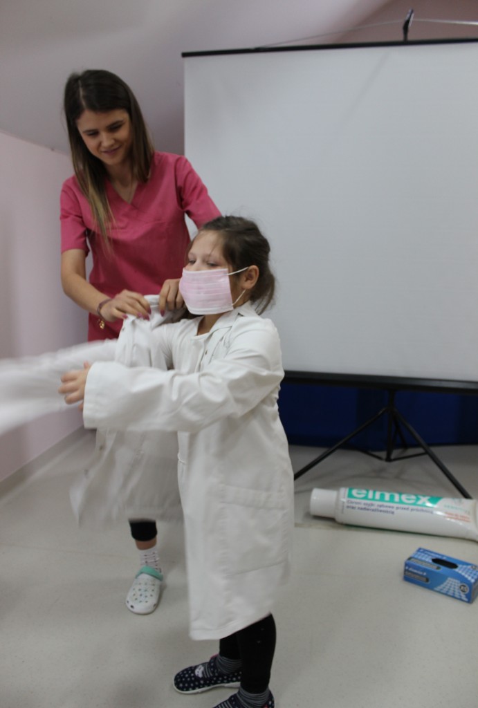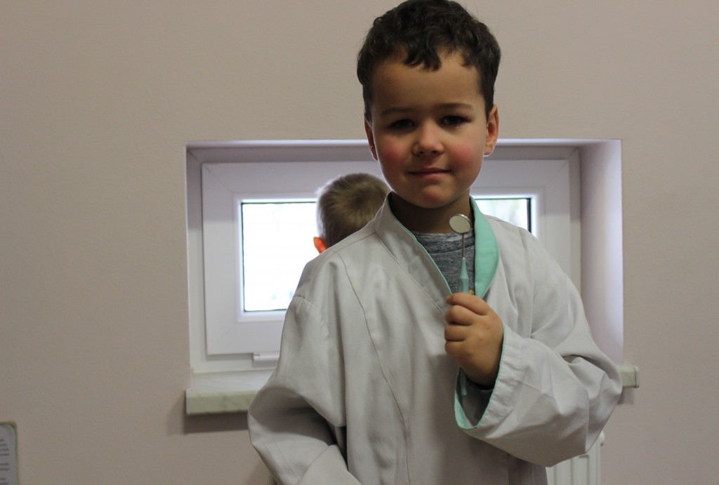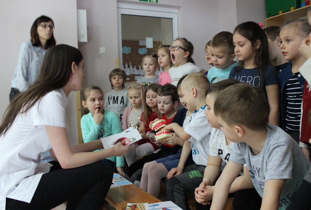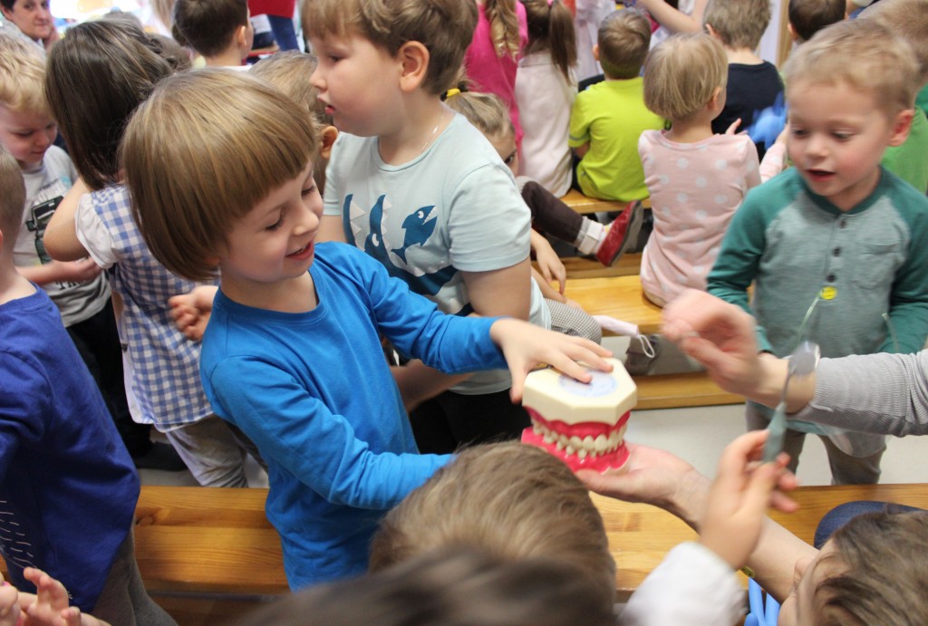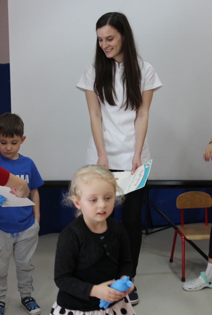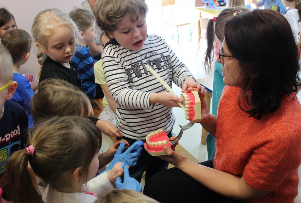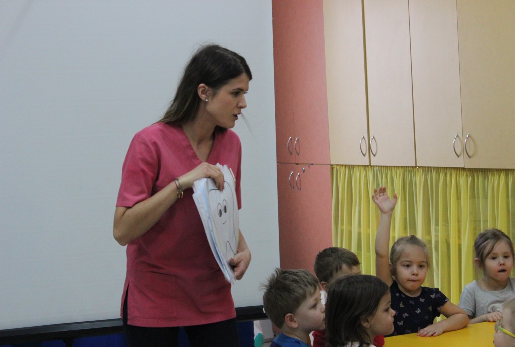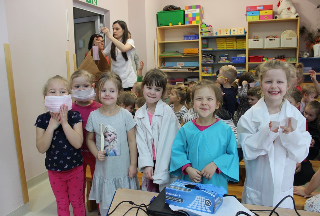 Zajęcia bogate były w różnorodne działania. Na początek dzieci obejrzały krótką bajkę z dr Ząbkiem w roli głównej, następnie Pani doktor oraz Pani higienistka przeprowadziły krótką pogadankę na temat higieny jamy ustnej oraz wizyt kontrolnych u dentysty. Niesamowitą atrakcją okazała się prezentacja atrybutów stomatologa. Dzieci miały okazję przymierzyć fartuchy, rękawiczki, zapoznać się ze sprzętami i na chwilę zamienić w prawdziwych dentystów. Na koniec każdy otrzymał dyplom upamiętniający odwiedziny naszych gości w przedszkolu.