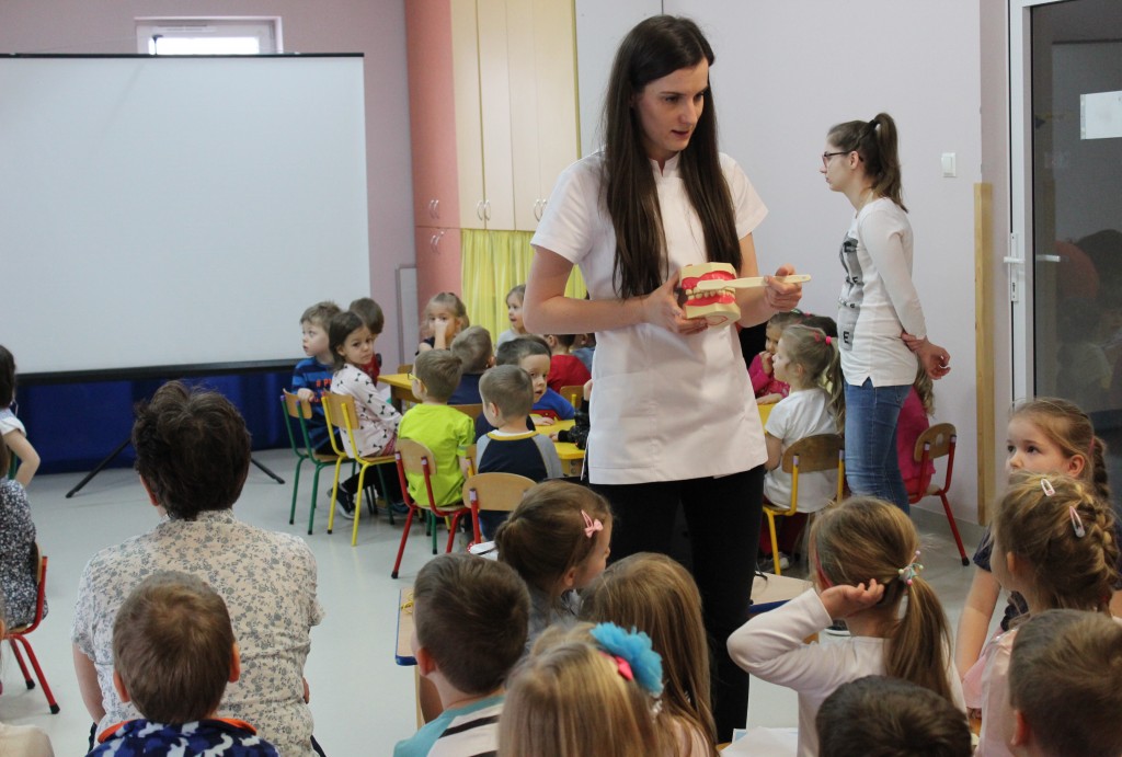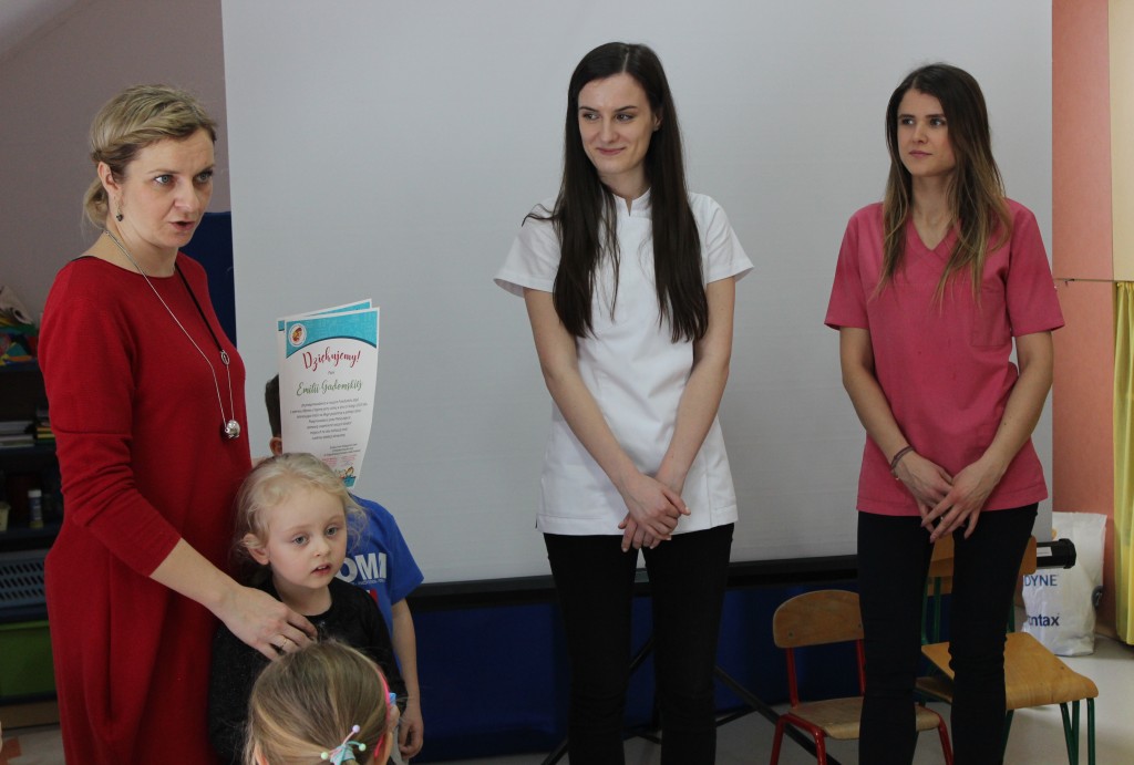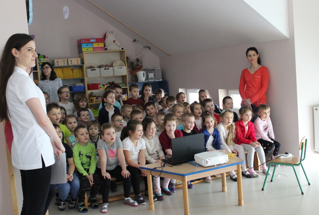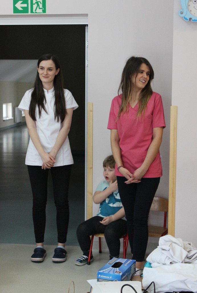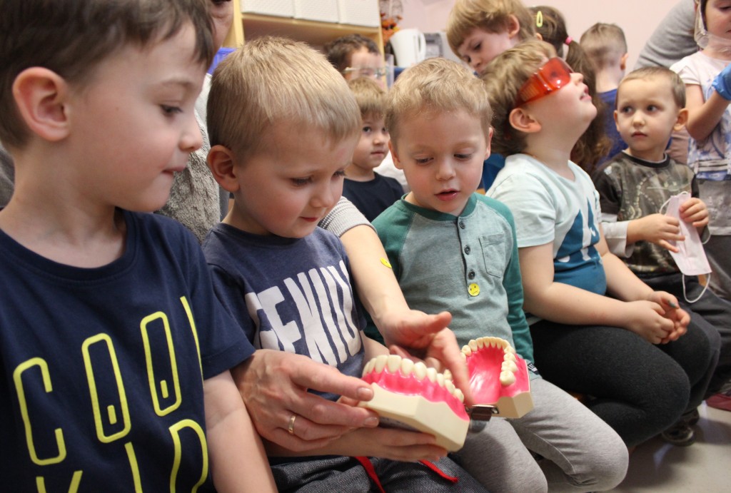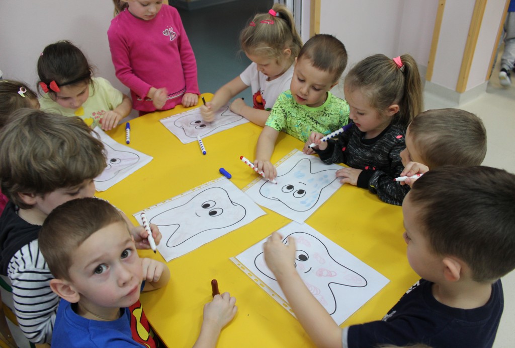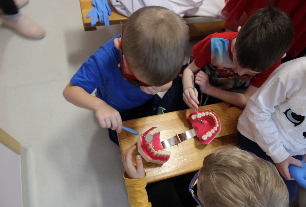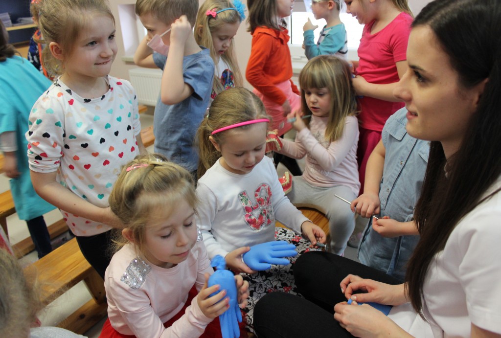 Zajęcia bogate były w różnorodne działania. Na początek dzieci obejrzały krótką bajkę z dr Ząbkiem w roli głównej, następnie Pani doktor oraz Pani higienistka przeprowadziły krótką pogadankę na temat higieny jamy ustnej oraz wizyt kontrolnych u dentysty. Niesamowitą atrakcją okazała się prezentacja atrybutów stomatologa. Dzieci miały okazję przymierzyć fartuchy, rękawiczki, zapoznać się ze sprzętami i na chwilę zamienić w prawdziwych dentystów. Na koniec każdy otrzymał dyplom upamiętniający odwiedziny naszych gości w przedszkolu.