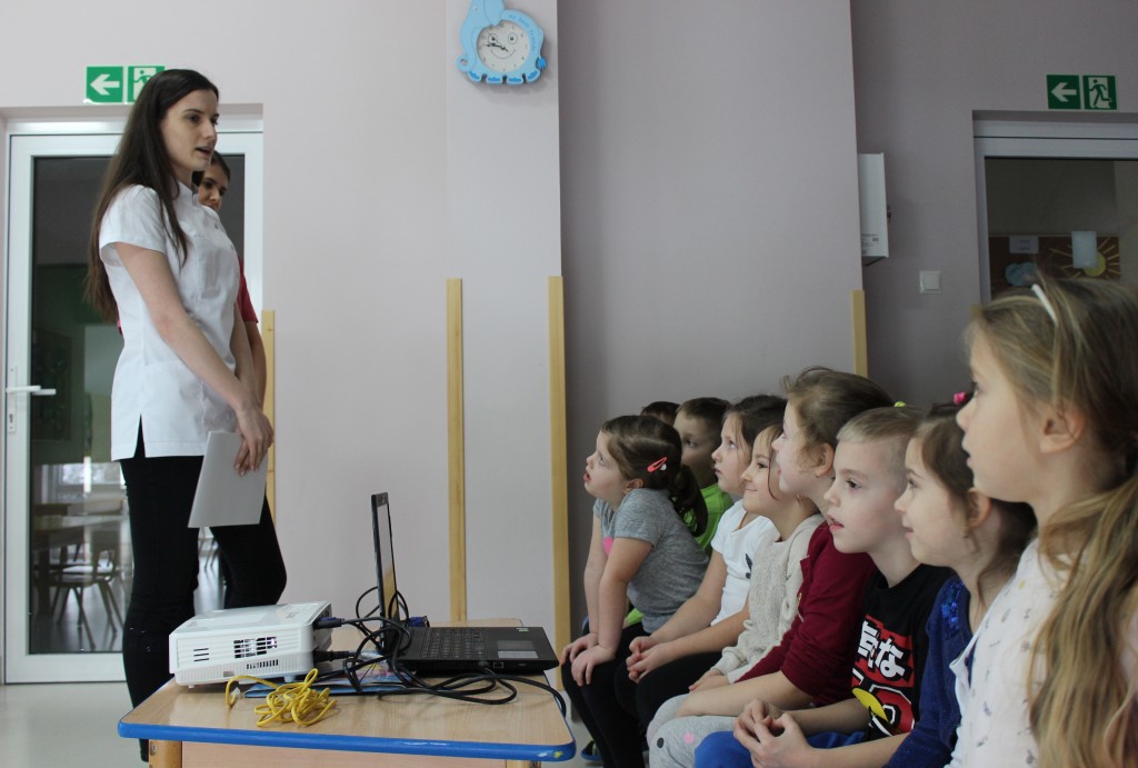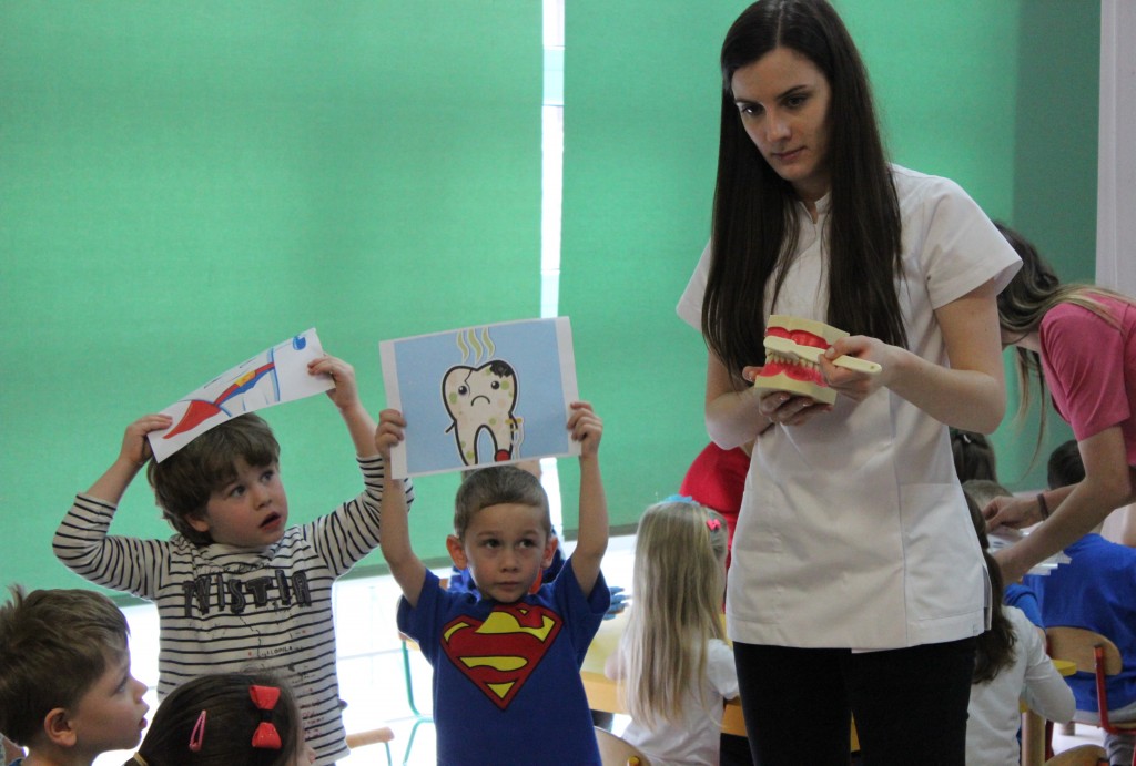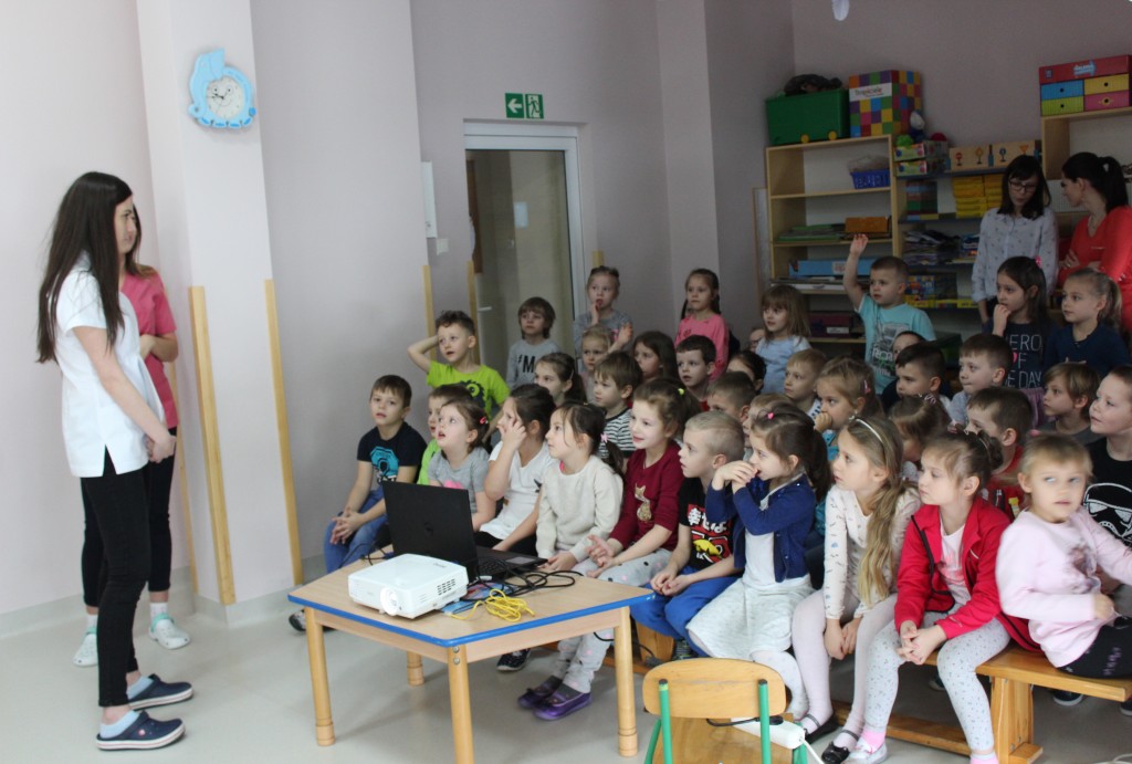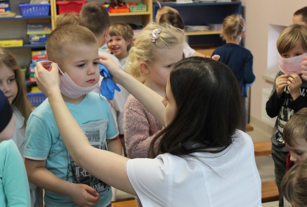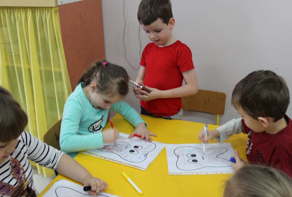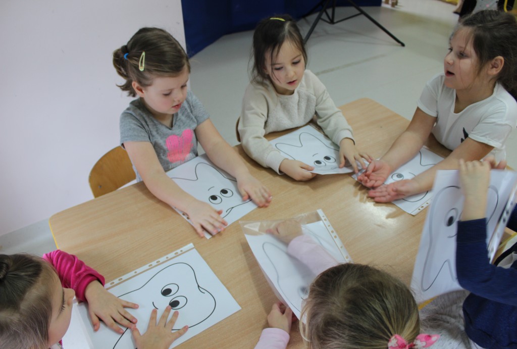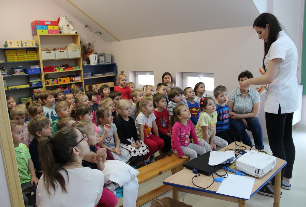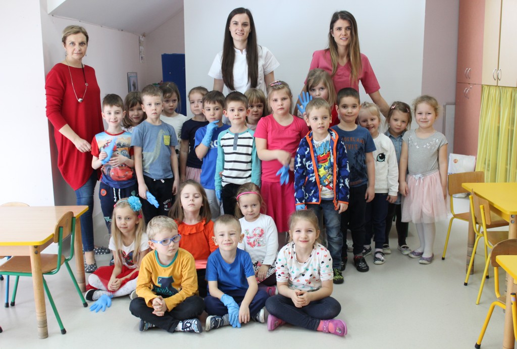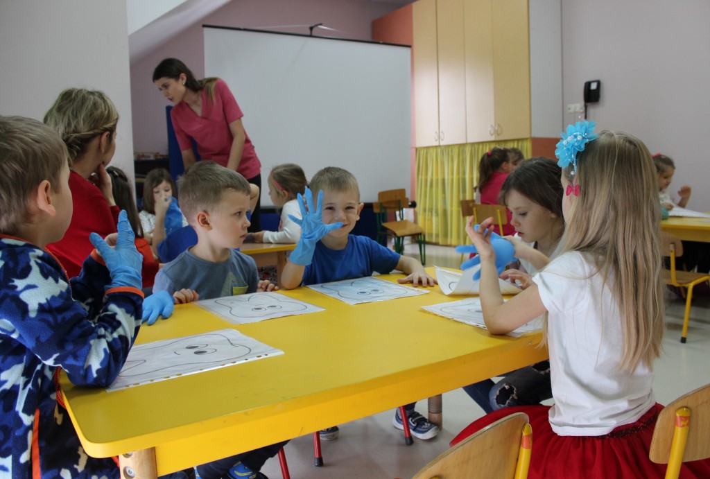 Zajęcia bogate były w różnorodne działania. Na początek dzieci obejrzały krótką bajkę z dr Ząbkiem w roli głównej, następnie Pani doktor oraz Pani higienistka przeprowadziły krótką pogadankę na temat higieny jamy ustnej oraz wizyt kontrolnych u dentysty. Niesamowitą atrakcją okazała się prezentacja atrybutów stomatologa. Dzieci miały okazję przymierzyć fartuchy, rękawiczki, zapoznać się ze sprzętami i na chwilę zamienić w prawdziwych dentystów. Na koniec każdy otrzymał dyplom upamiętniający odwiedziny naszych gości w przedszkolu.
