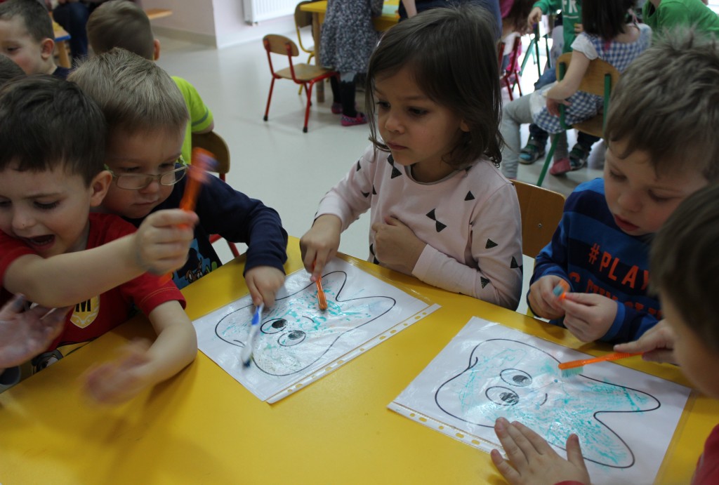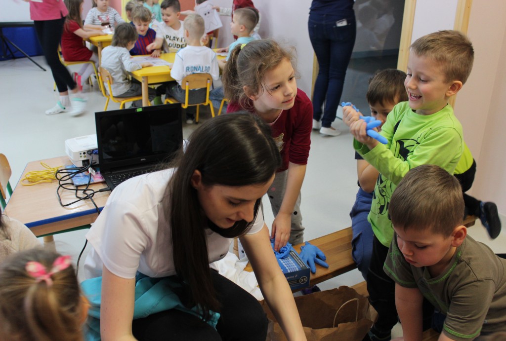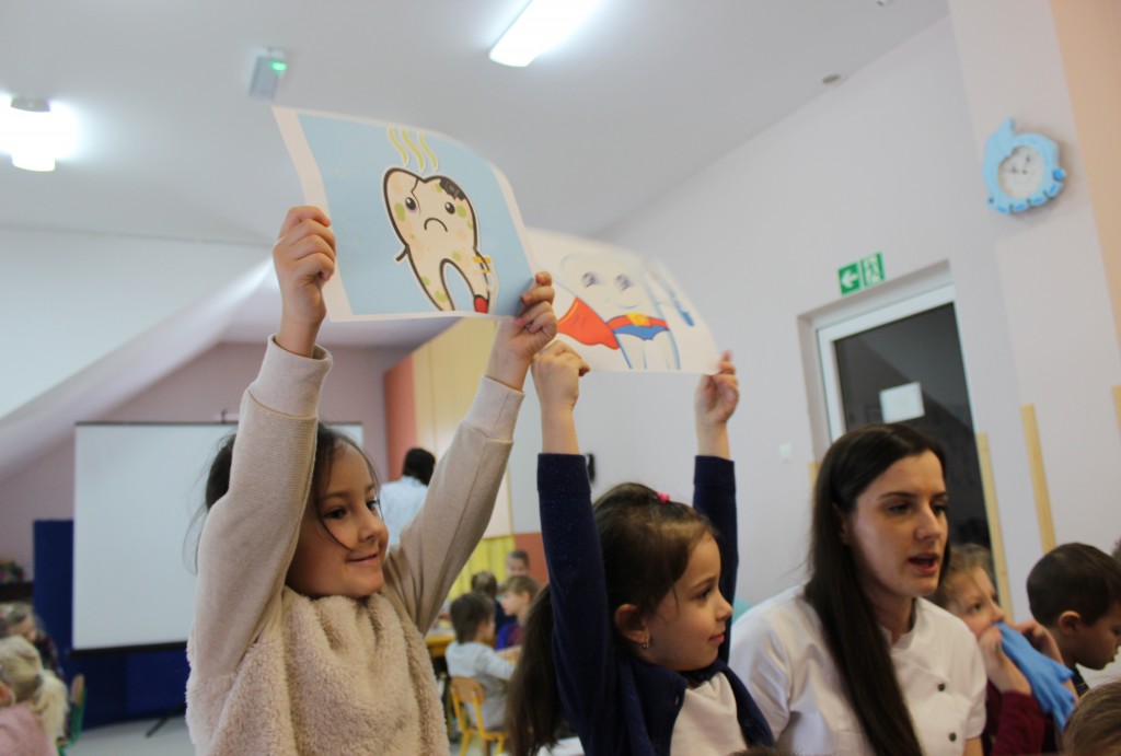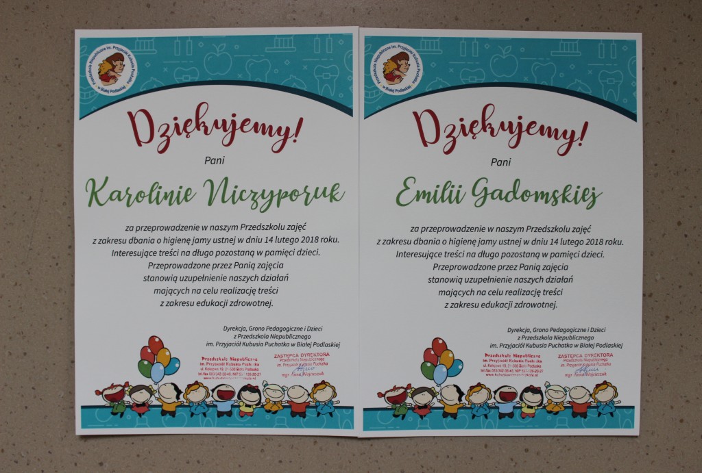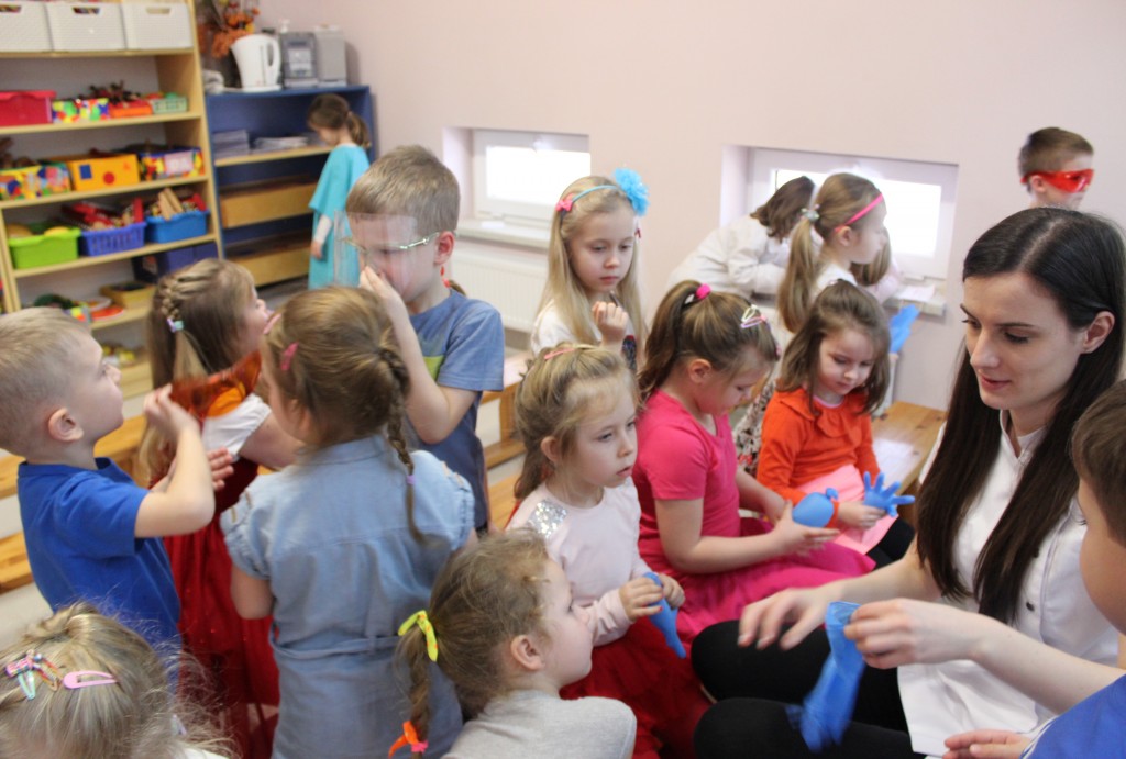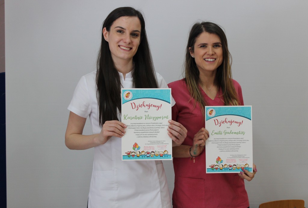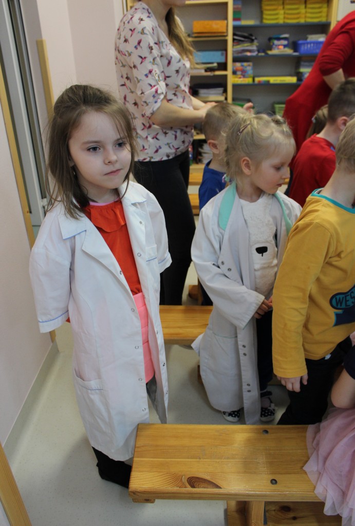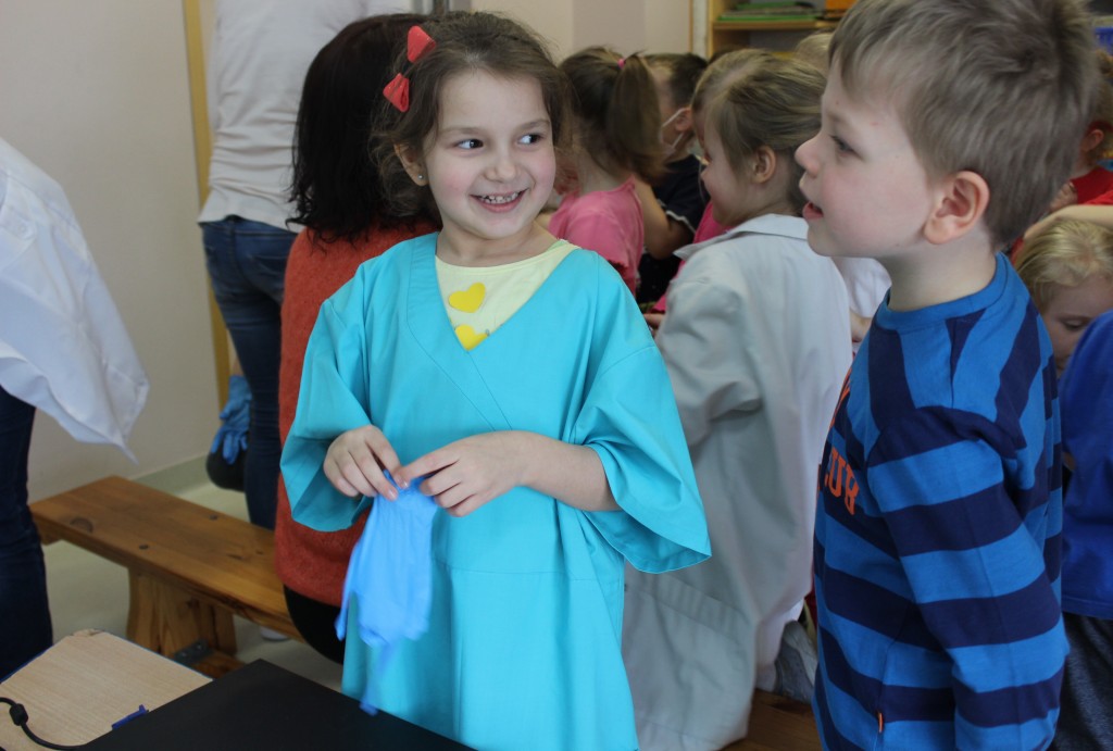 Zajęcia bogate były w różnorodne działania. Na początek dzieci obejrzały krótką bajkę z dr Ząbkiem w roli głównej, następnie Pani doktor oraz Pani higienistka przeprowadziły krótką pogadankę na temat higieny jamy ustnej oraz wizyt kontrolnych u dentysty. Niesamowitą atrakcją okazała się prezentacja atrybutów stomatologa. Dzieci miały okazję przymierzyć fartuchy, rękawiczki, zapoznać się ze sprzętami i na chwilę zamienić w prawdziwych dentystów. Na koniec każdy otrzymał dyplom upamiętniający odwiedziny naszych gości w przedszkolu.