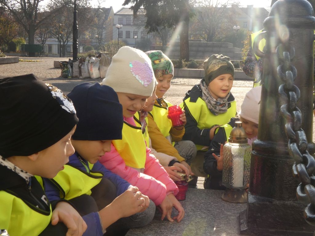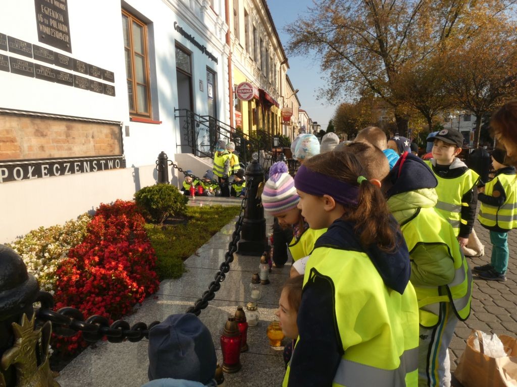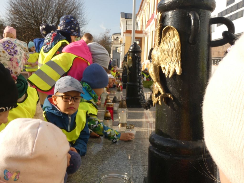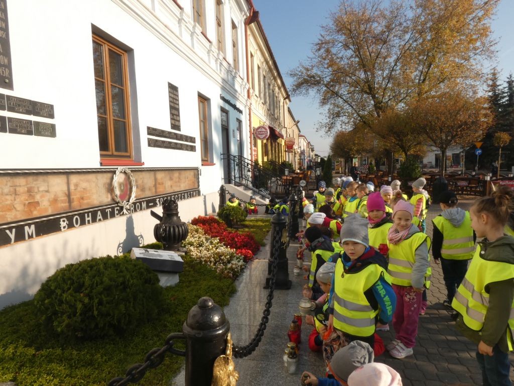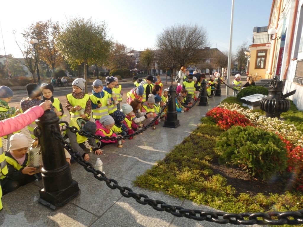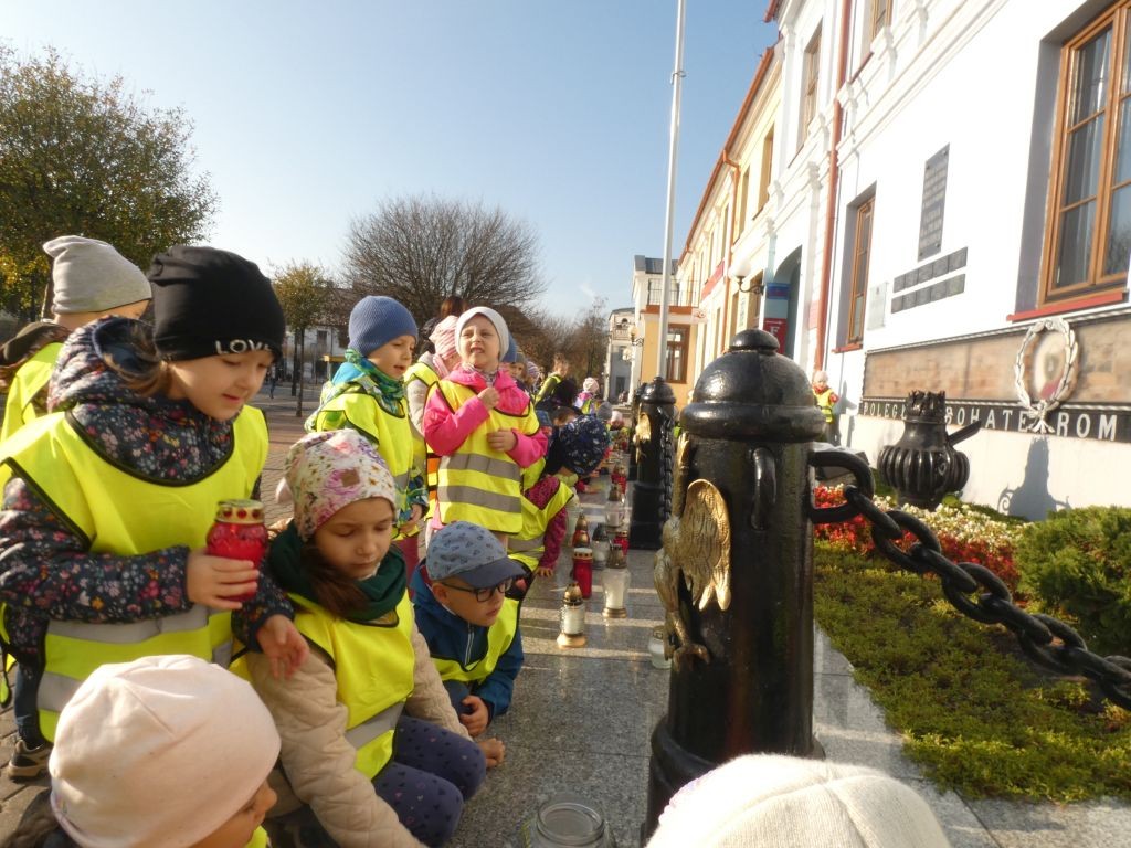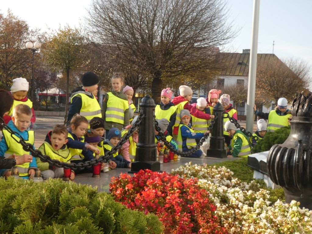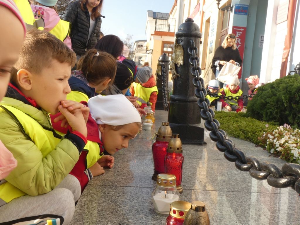 Dlatego też 25 października, my – wszystkie 6-latki, jako reprezentacja całej naszej placówki, udaliśmy się na Plac Wolności, gdzie zgłębialiśmy historię Ściany Straceń jako miejsca egzekucji upamiętnionego już w 1945 roku. W tym miejscu zabezpieczono ślady kul na ceglanym murze i osłonięto je przeszkloną metalową ramą. Wydzielona część chodnika przy ścianie budynku symbolicznie ogrodzona jest słupkami z orłami oraz łańcuchem.