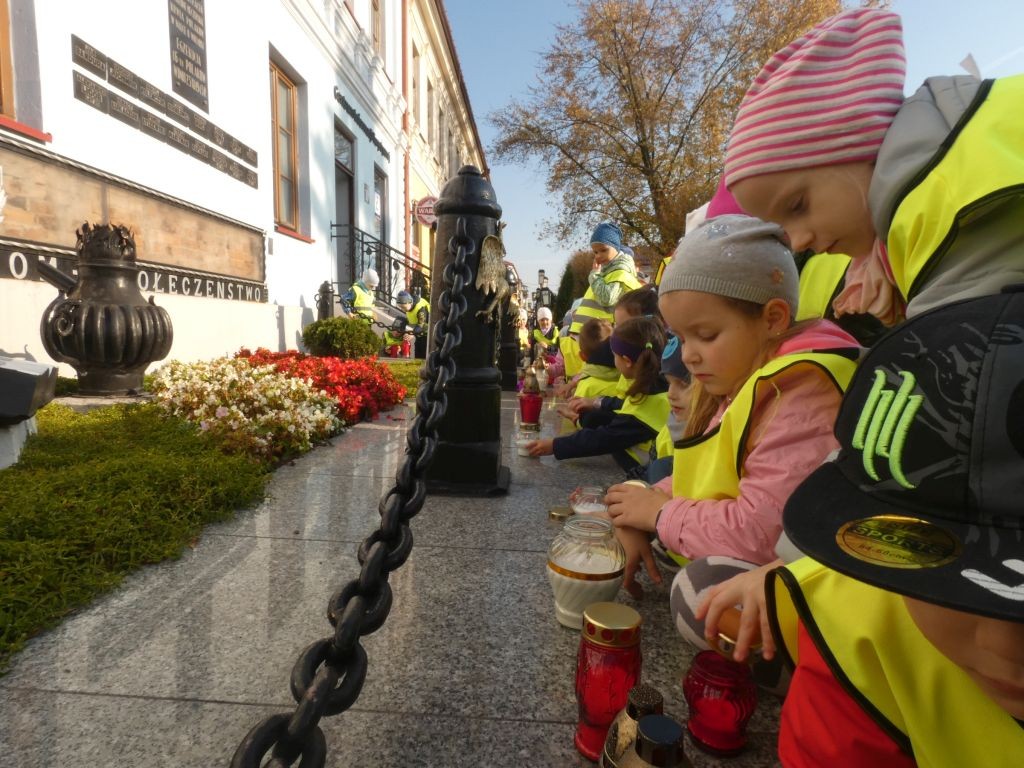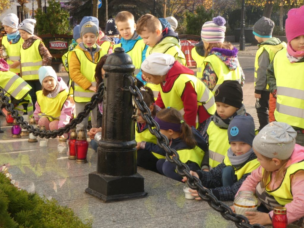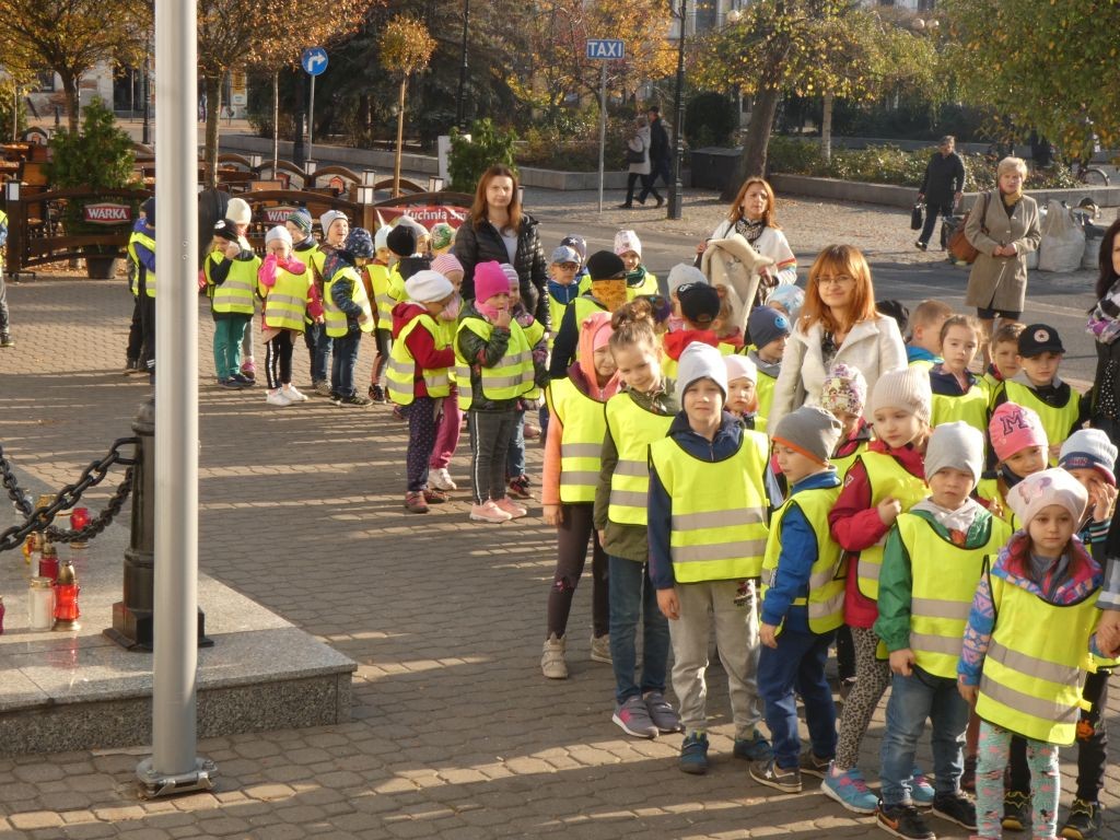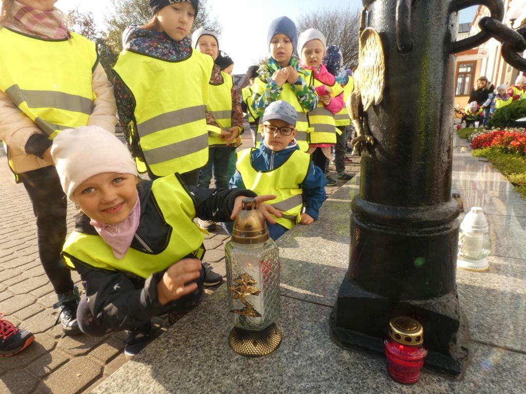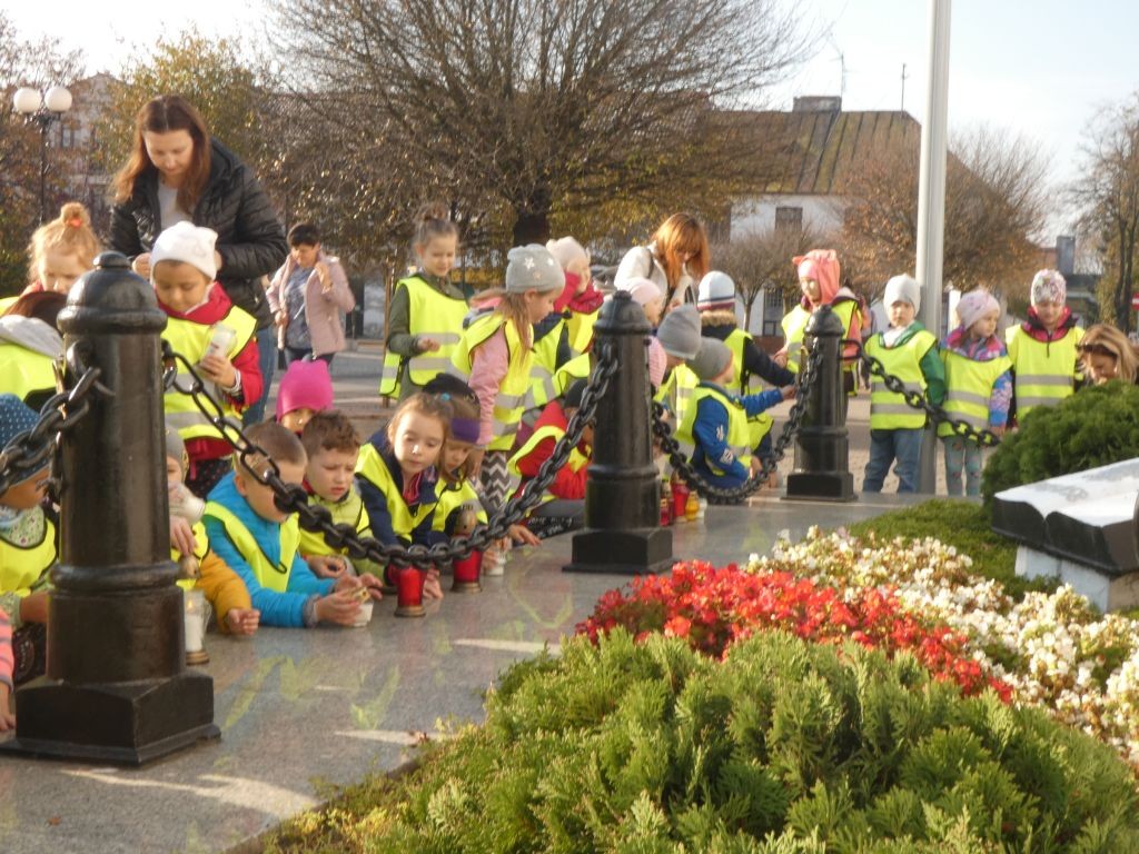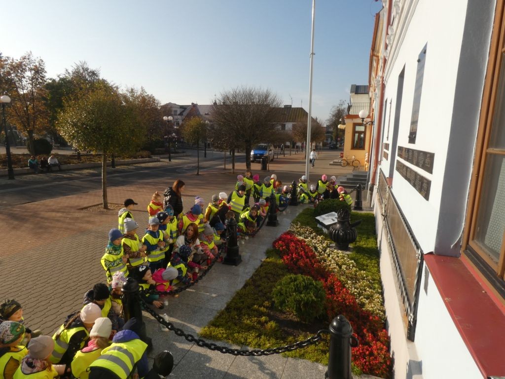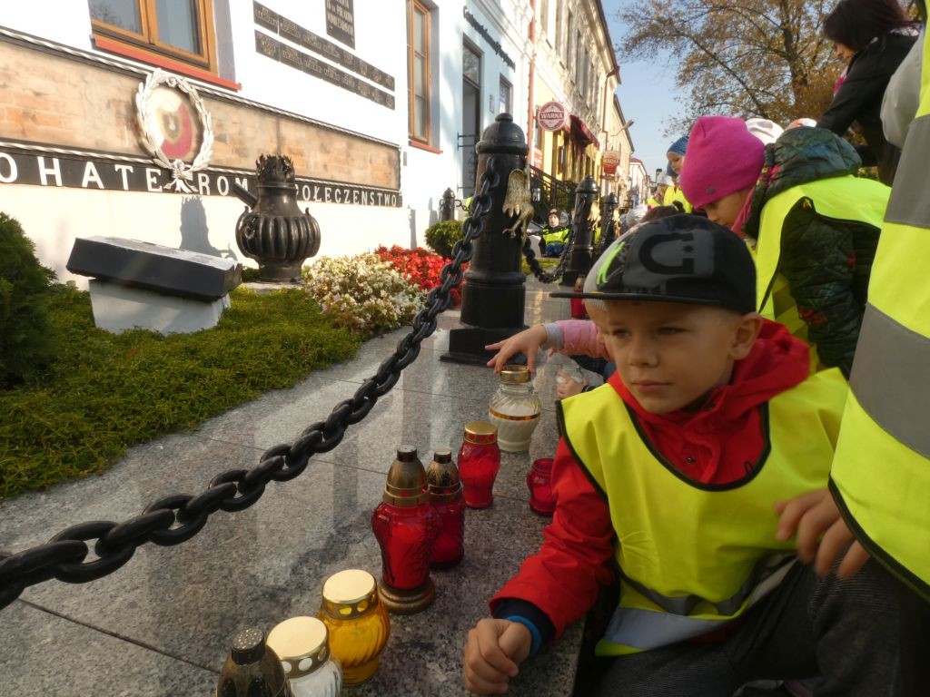 Dlatego też 25 października, my – wszystkie 6-latki, jako reprezentacja całej naszej placówki, udaliśmy się na Plac Wolności, gdzie zgłębialiśmy historię Ściany Straceń jako miejsca egzekucji upamiętnionego już w 1945 roku. W tym miejscu zabezpieczono ślady kul na ceglanym murze i osłonięto je przeszkloną metalową ramą. Wydzielona część chodnika przy ścianie budynku symbolicznie ogrodzona jest słupkami z orłami oraz łańcuchem.