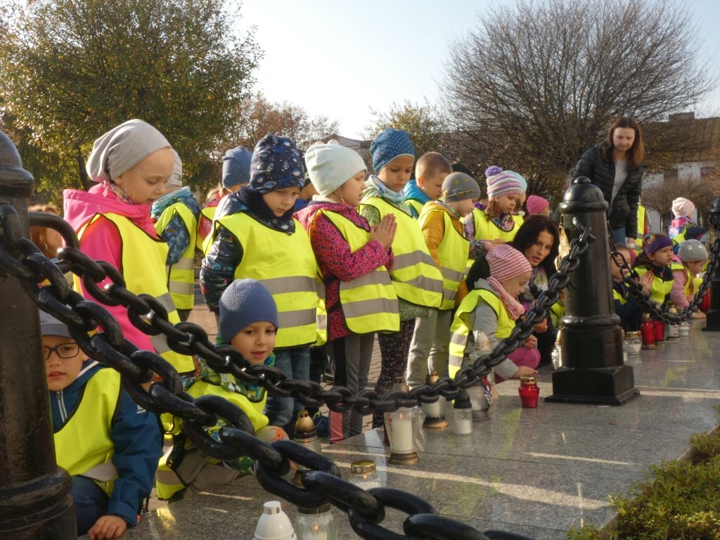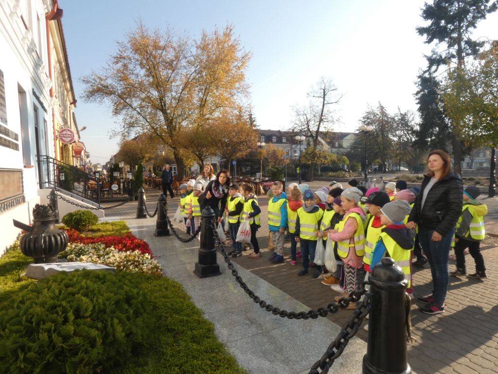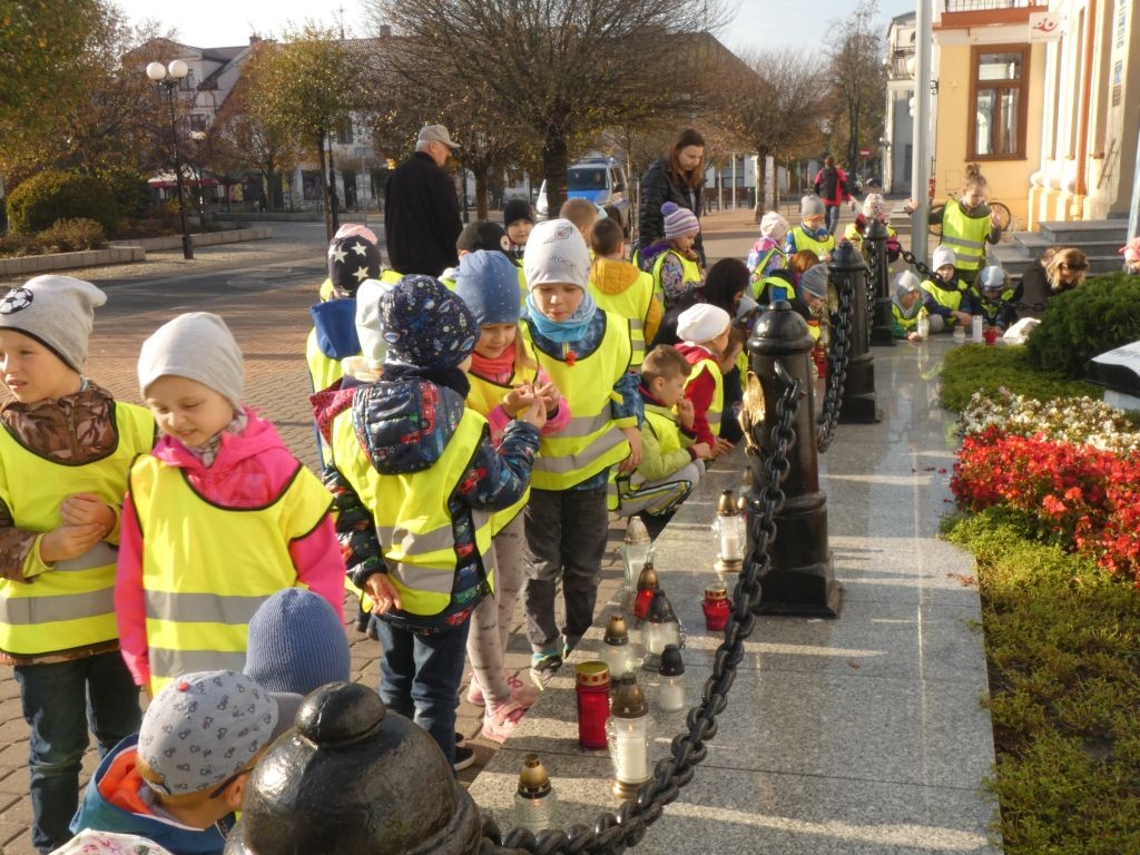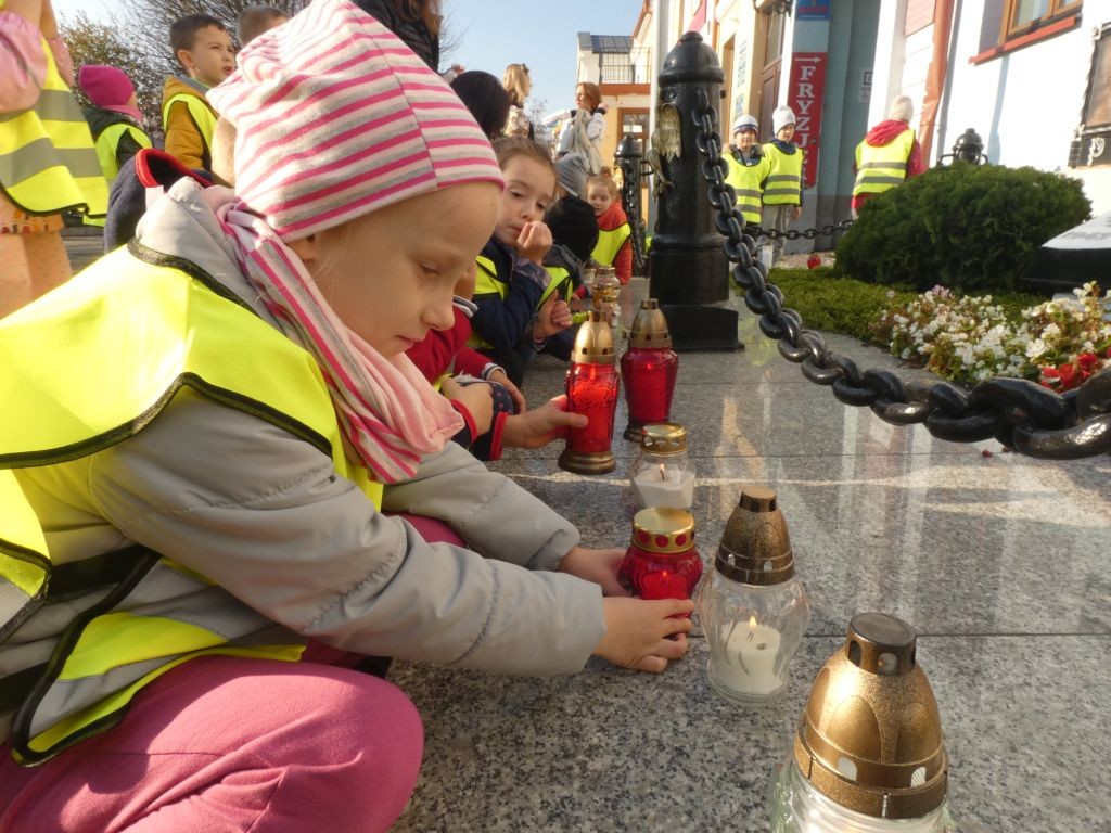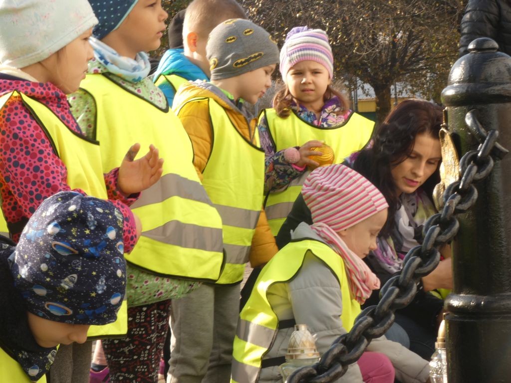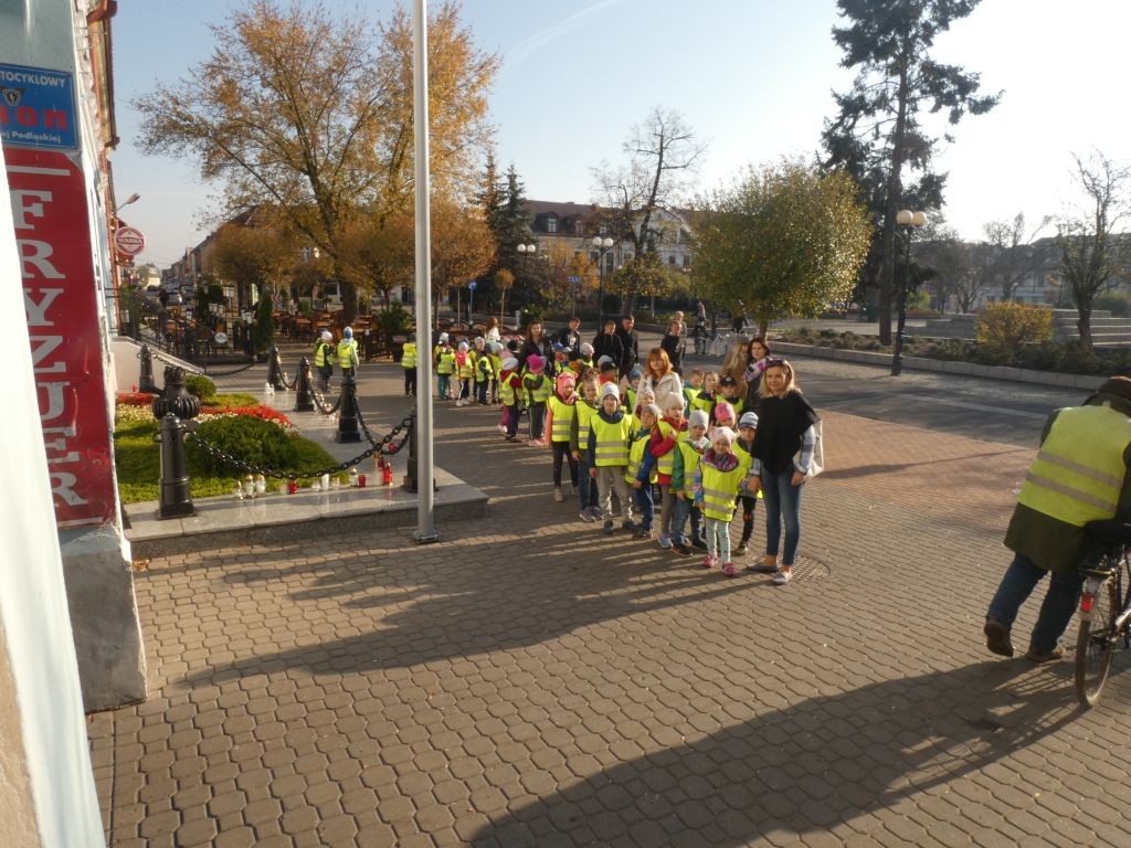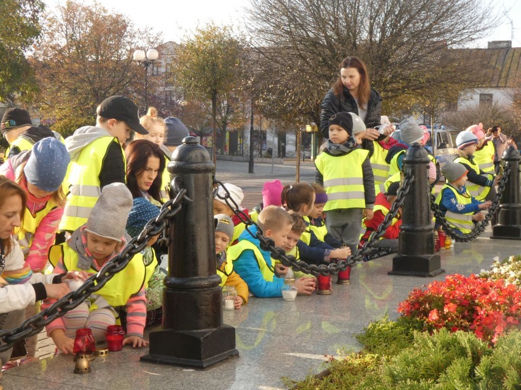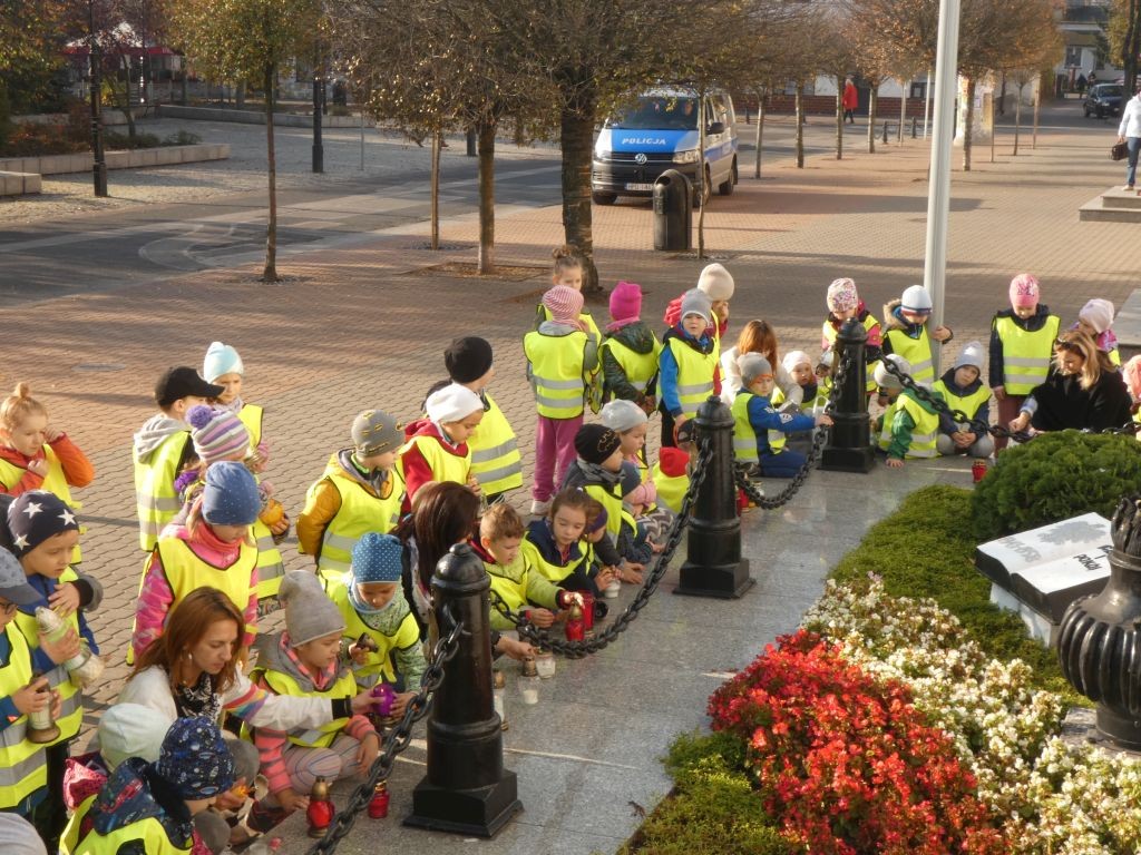 Dlatego też 25 października, my – wszystkie 6-latki, jako reprezentacja całej naszej placówki, udaliśmy się na Plac Wolności, gdzie zgłębialiśmy historię Ściany Straceń jako miejsca egzekucji upamiętnionego już w 1945 roku. W tym miejscu zabezpieczono ślady kul na ceglanym murze i osłonięto je przeszkloną metalową ramą. Wydzielona część chodnika przy ścianie budynku symbolicznie ogrodzona jest słupkami z orłami oraz łańcuchem.