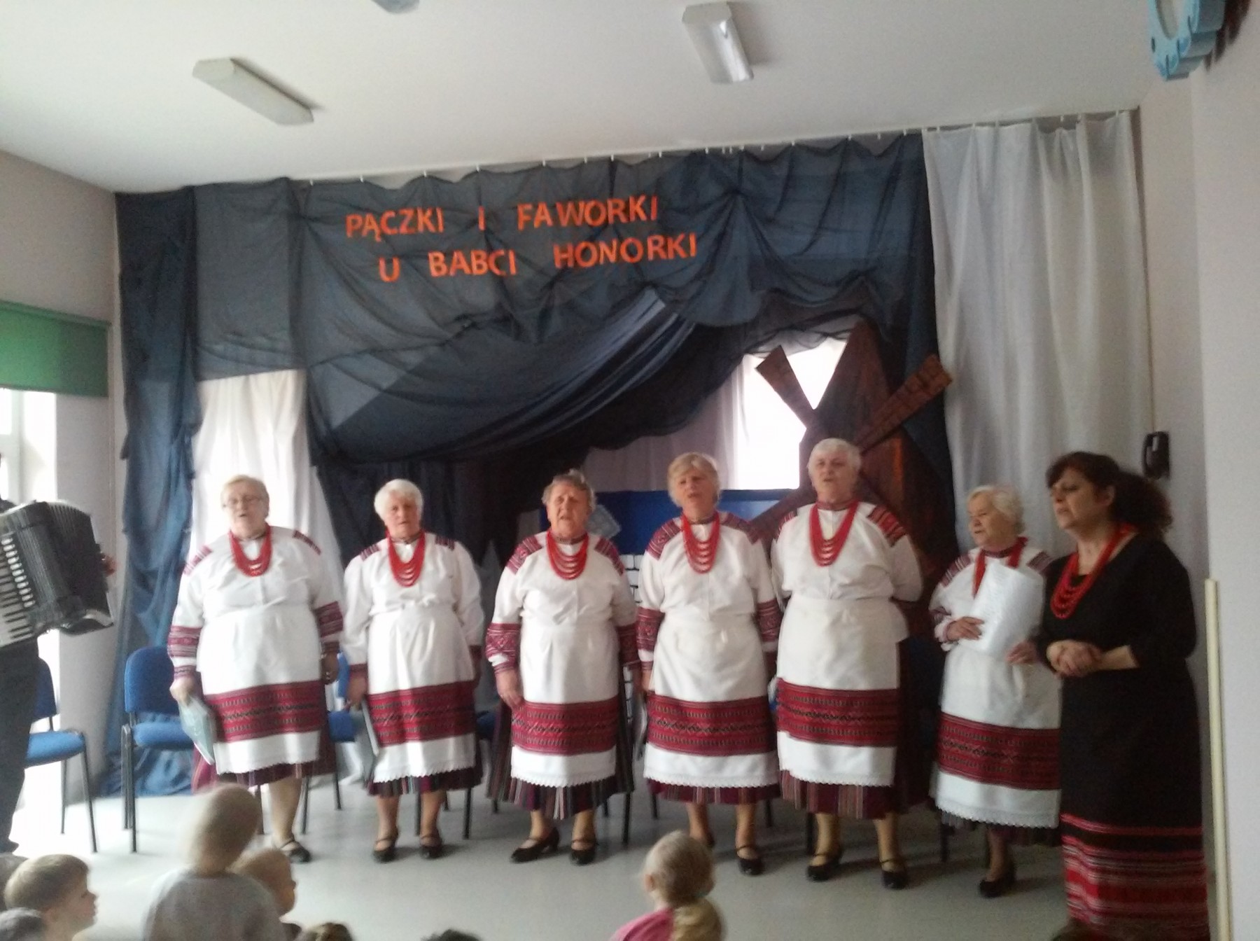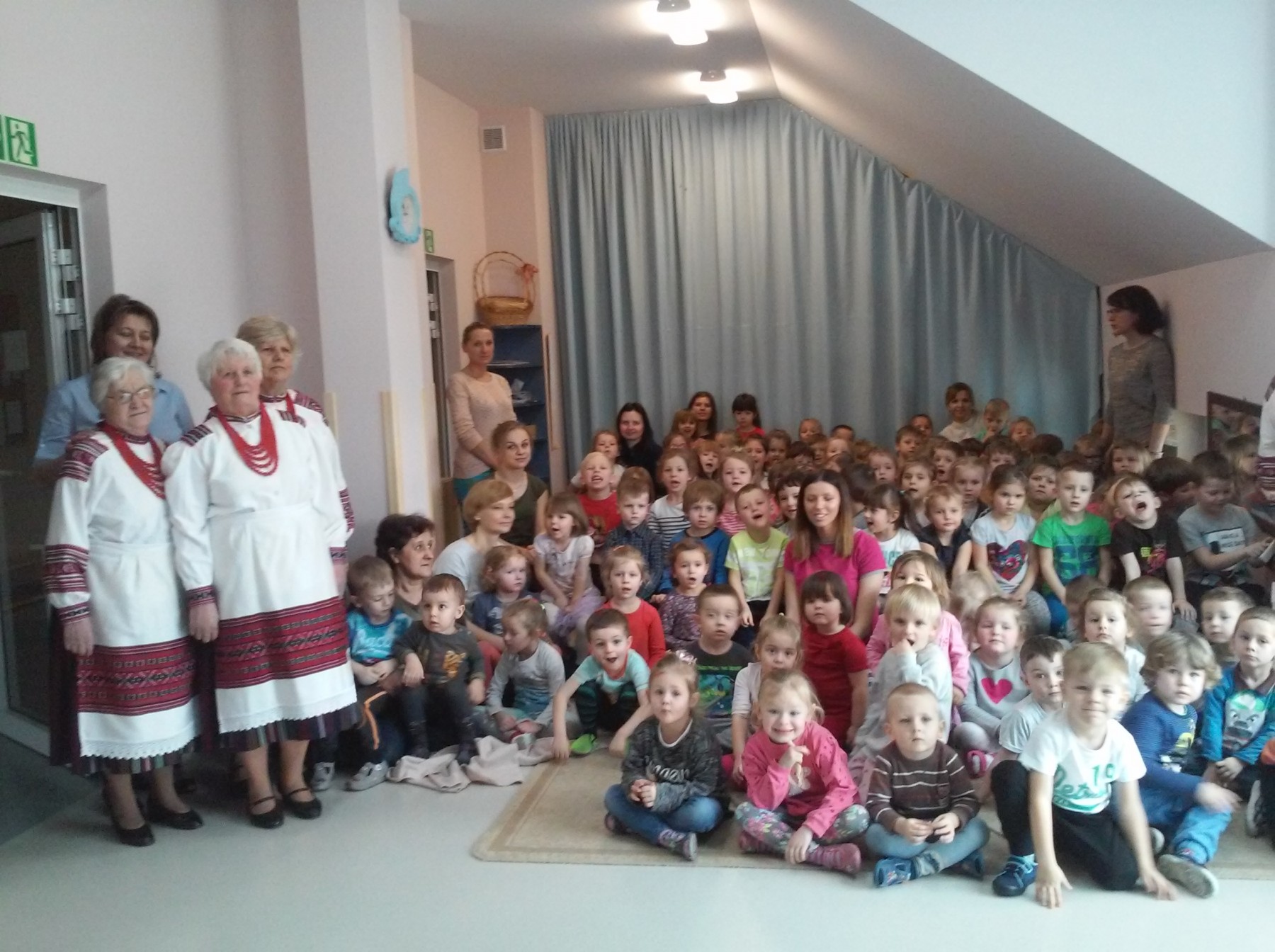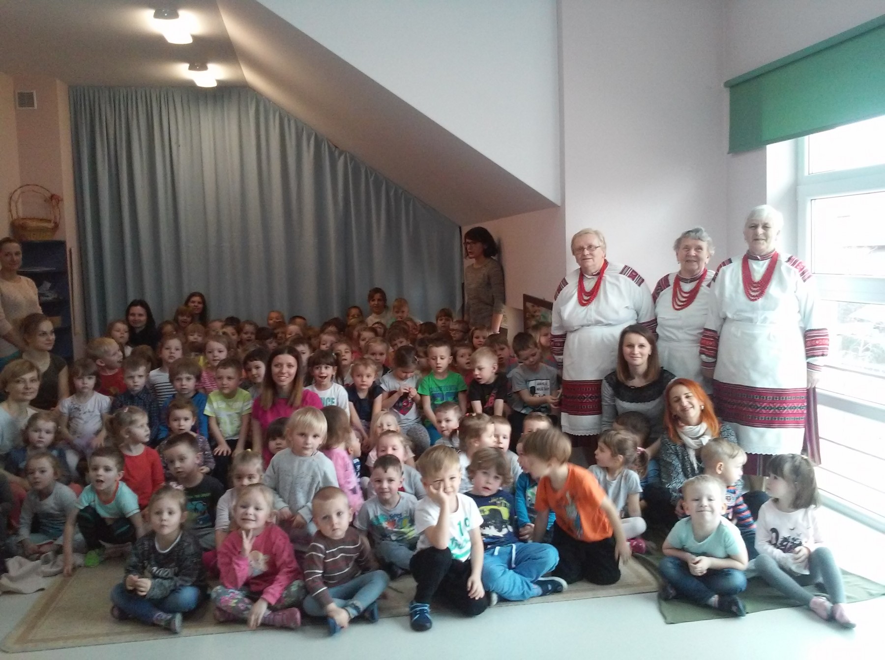 W środę 22 lutego gościliśmy znamienitych gości z zespołu obrzędowo-śpiewaczego z Hruda. Zespół powstał w 1997 roku. W 2007 roku zespół obchodził swoje dziesięciolecie i został nagrodzony Złotym Medalem "Zasłużony dla Powiatu Bialskiego" oraz Złotym Medalem "Zasłużony dla Gminy Biała Podlaska". Przedszkolaki były bardzo podekscytowane występem. Duże zainteresowanie wzbudziły ludowe stroje występujących pań, a ich melodyjne głosy zachęcały do słuchania i nie tylko, ponieważ niektóre przyśpiewki i piosenki znane były obecnej na występnie kadrze przedszkola, a nawet dzieciom np. „Czerwone jabłuszko”, czy „Szła dzieweczka do laseczka”. Podczas spotkania dzieci miały okazję posłuchać gwary ludowej i rymowanych wierszy o zapustach. Dowiedziały się również jakie to tradycyjne potrawy spożywano na dawnej podlaskiej wsi. Po występie pani dyrektor Beata Rychlik podziękowała zaproszonym gościom za występ, który na długo pozostanie w naszej pamięci. Nie zabrakło również wspólnych zdjęć, które będą pamiątką tego ciekawego wydarzenia.